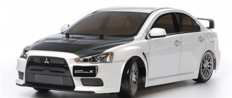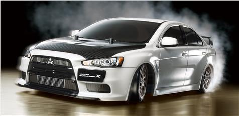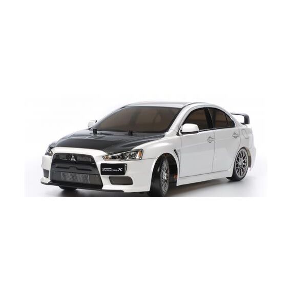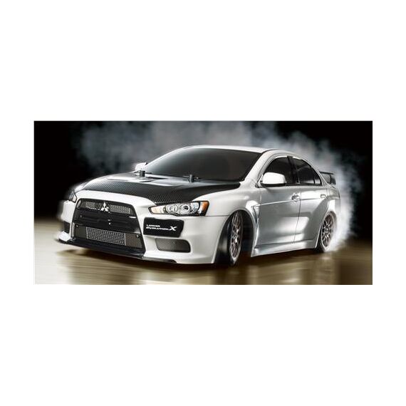 TAMIYA präsentiert den Mitsubishi Lancer Evo.X auf dem bewährten TT-02 Drift Chassis. Die Drift Version ist bereits serienmässig mit CVA Öldruckstoßdämpfern, Kardanantrieb, 24mm Drift-Spec Reifen, Kugellager, Sport Tuned Motor und Aluminium Kühlkörper ausgestattet. Die Karosserie stammt original aus dem Bausatz 58440 und ist mit Seitenspiegeln etc. ausgestattet. Highlight ist das beiliegende LED Lichtset!