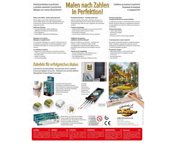Stabiler Malkarton mit Leinenstruktur 24 x 30 cm. Exakte Konturenzeichnungen mit gut lesbaren Zahlen. Acrylfarben auf Wasserbasis. Kein Farbmischen erforderlich. Feiner Malpinsel. Kontrollblatt und ausführliche Anleitung für erfolgreiches Malen.