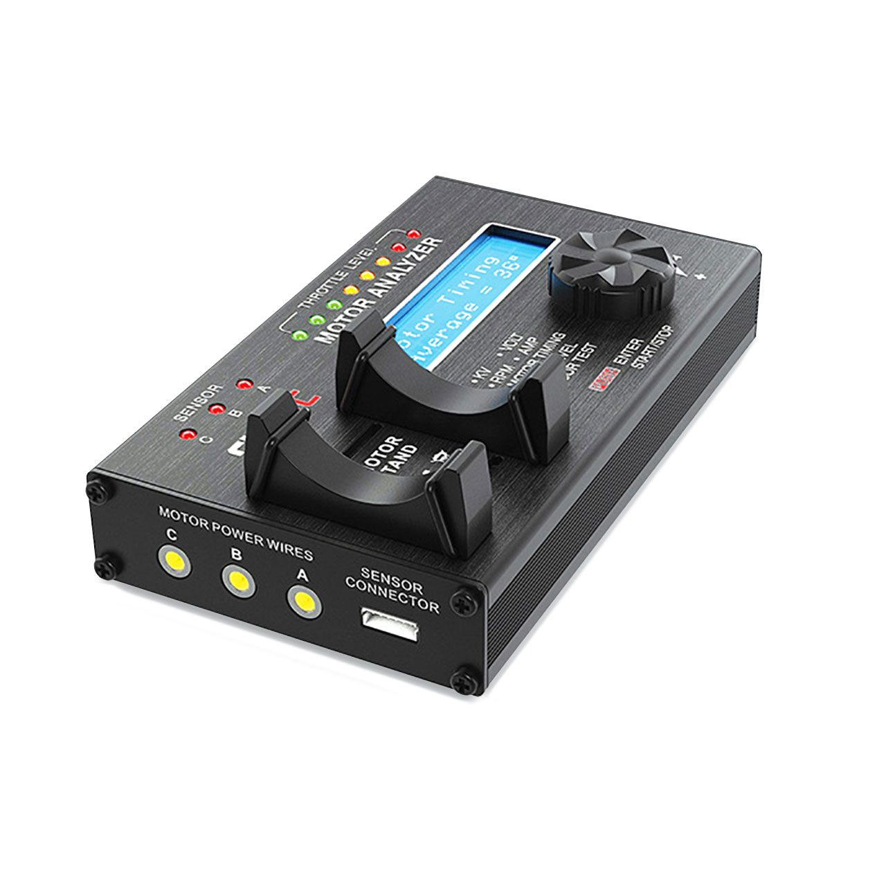 Das SKYRC Motor Analyse Gerät ist ein hoch präzises elektronisches Gerät, welches ausschließlich dafür entwickelt wurde den KV Wert, die U/min (Drehzahl), Stromaufnahme, Motor Timing, Vibrationen und die Funktion des Hall Sensors eines Bushless Motors zu überprüfen bzw. messen. Er besitzt ein zweizeiliges 16 Zeichen LCD Display um alle Werte in Echtzeit anzuzeigen. Geeignet ist das Gerät für sensorlose als auch sensorgesteuerte Brushless Motoren.
