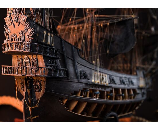 - Zahlreiche Details im Rumpf, im Inneren, komplette Kanonen, Munition, Hängematten, Waren, Fässer, etc.