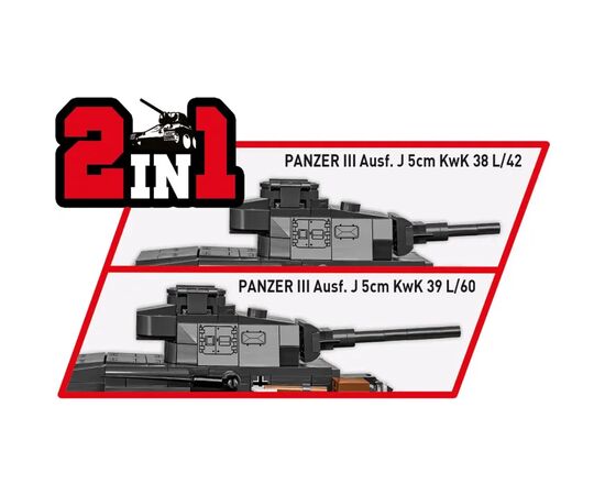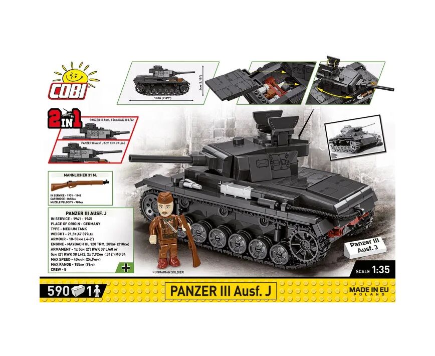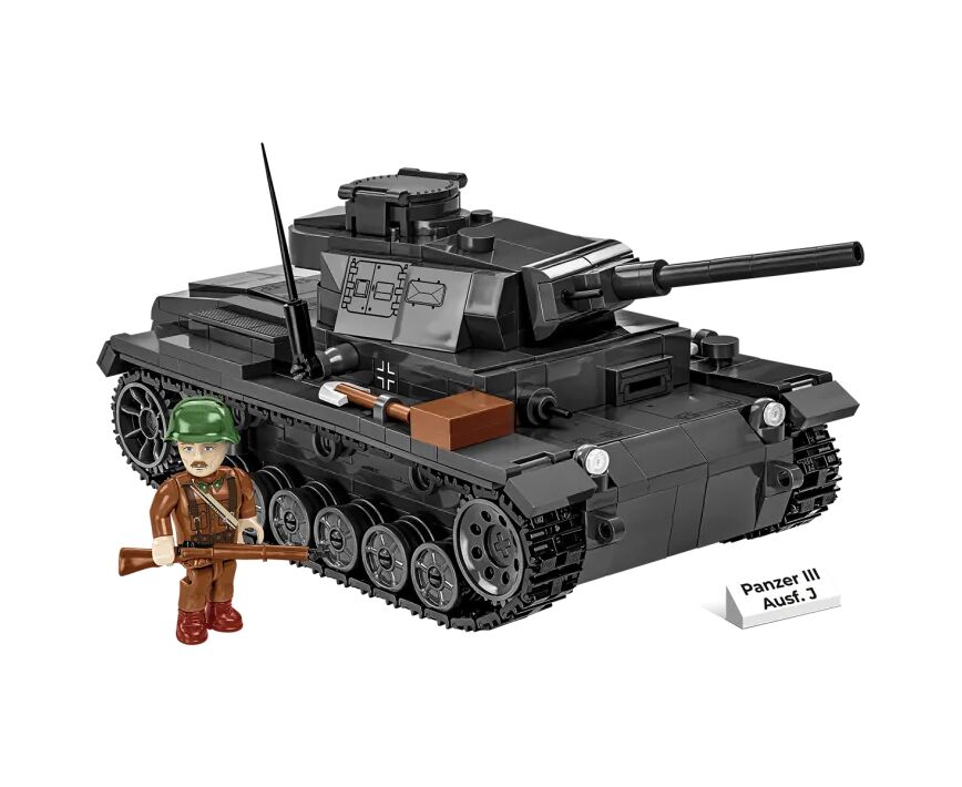 Panzerkampfwagen III ist ein deutscher mittlerer Panzer aus dem Zweiten Weltkrieg. Es war das am dynamischsten entwickelte Modell, das in der Armee des Dritten Reiches eingesetzt wurde. Viele Versionen davon entstanden zwischen 1937 und 1943. Das erfolgreiche Fahrgestell diente als Grundlage für die Produktion weiterer Militärfahrzeuge. Es handelte sich um eine sehr gute Konstruktion, die bis zum Ende des Krieges genutzt wurde. Die Besatzung bestand aus 5 Personen. Der Panzer nahm an Militäreinsätzen an allen europäischen Fronten und in Nordafrika teil. Dieses Mal haben wir ein Modell für Einsätze an der Ostfront des Zweiten Weltkriegs vorbereitet. Die ungarische Armee unterstützte aktiv die deutschen Truppen im Osten, weshalb das Set neben dem Panzermodell eine sorgfältig gestaltete Figur eines ungarischen Soldaten enthält, der mit einem zweifarbigen Gewehr, einem Helm und einer Futtermütze mit Aufdrucken ausgestattet ist.