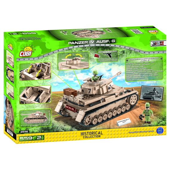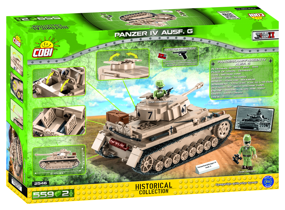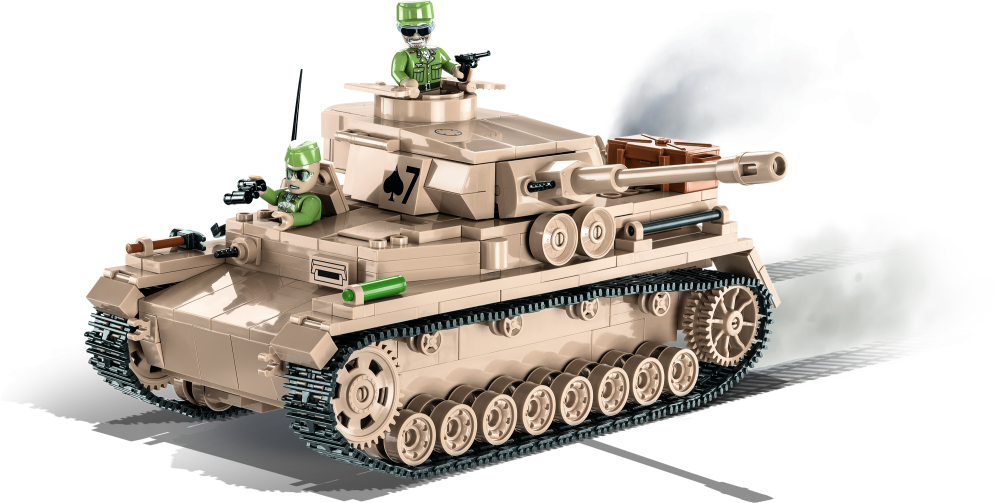 Wir haben ein Modell des Panzerkampfwagen IV aus bis zu 559 hochwertigen COBI-Bausteinen gebaut. Ein originalgetreu reproduziertes Fahrzeug aus der Zeit des Zweiten Weltkriegs wurde mit Drucken bedeckt, die bei intensivem Spiel nicht verschrammen oder sich abnutzen. Das Set enthält auch zwei Figuren der deutschen Afrikakorps-Soldaten. Der Panzerkommandant ist mit einer P08 Parabellum-Pistole und einer Gummibrille ausgestattet. Der Fahrer ist mit einem neuen Fernglas ausgestattet. Sie können das im Lieferumfang enthaltene Zubehör am Tank befestigen oder die Figuren damit ausstatten. Wir haben eine Brechstange, einen Hammer, eine Schnur und eine Truhe beigefügt. Viele bewegliche Elemente wie der Panzerturm, der Lauf, die rotierenden Räder und Ketten sowie die kippbaren Serviceklappen, die das Motormodell verstecken, sorgen für viel Spaß für die jüngsten Militärbegeisterten. Erwachsene Sammler und Fans von Geschichte und Rüstung werden mit diesem Modell sicherlich ihre Sammlung schmücken. Abgerundet wird das Ganze durch einen Block mit dem gedruckten Modellnamen.