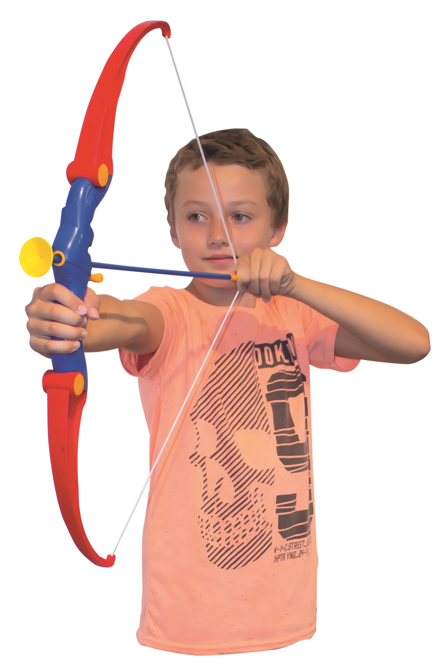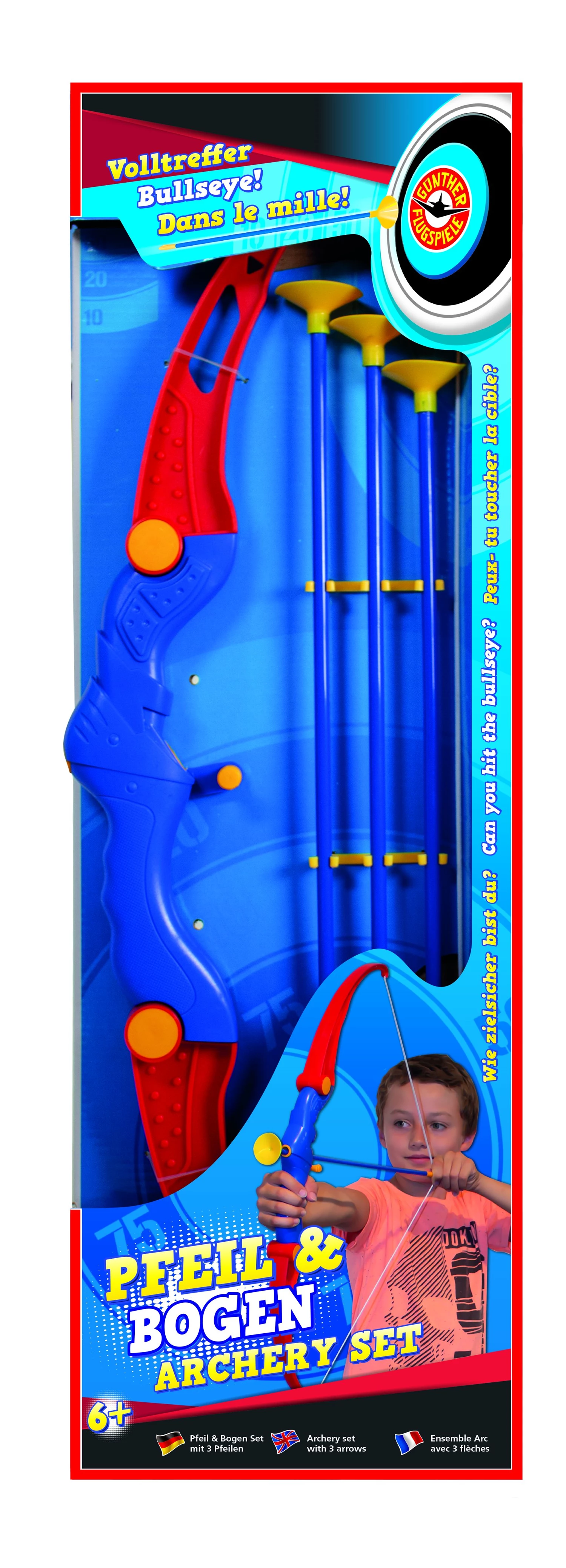 Bogenset aus hochwertigem Kunststoff inklusive 3 Pfeilen. Zielscheibe auf der Rückseite der Verpackung zum Ausschneiden. Grösse des Bogens: 64.5 cm. Länge der Pfeile: 52 cm. ACHTUNG: Nicht für Kinder unter 3 Jahren geeignet (Erstickungsgefahr)! Nur die mitgelieferten Pfeile verwenden und nicht auf Personen/Tiere zielen!