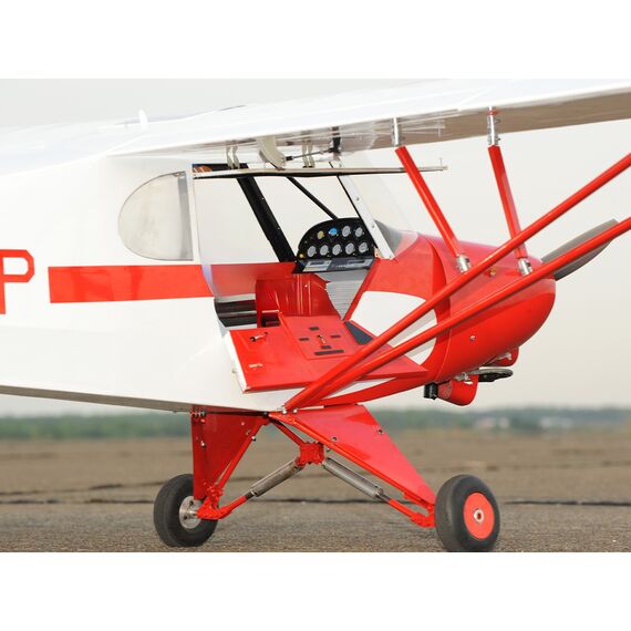 Das Modell ist bis zu 95% vorgefertigt und mit Oracover Folie bespannt, hochwertige Kleinteile die für den Aufbau benötigt werden sind im Lieferumfang enthalten. Die Piper Super Cup PA-18 ist für den Betrieb mit einem 30ccm Benzinmotor oder einem 63mm Brushless Motor ausgelegt, für beide Antriebsvarianten ist das Zubehör ebenfalls im Lieferumfang enthalten. Dank der komplett abnehmbaren Kabinenhaube kann der Akkuwechsel schnell realisiert werden. Die zweiteilige Tragfläche und der zweiteilige Rumpf ermöglichen einen einfachen und komfortablen Transport.