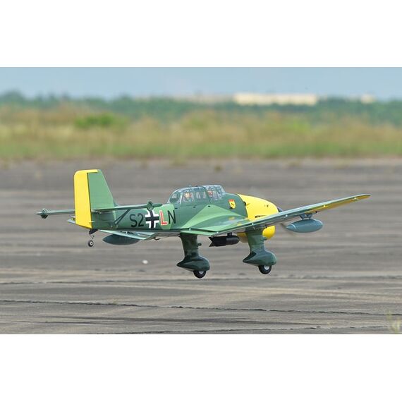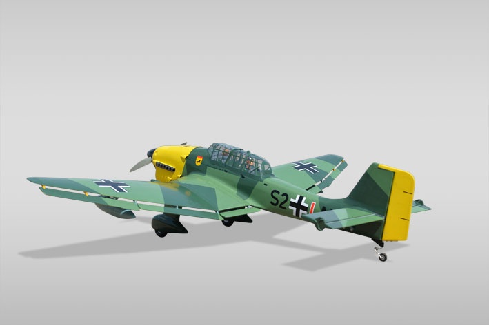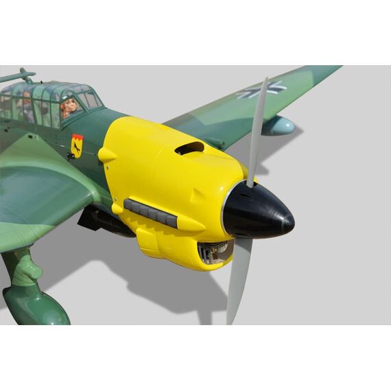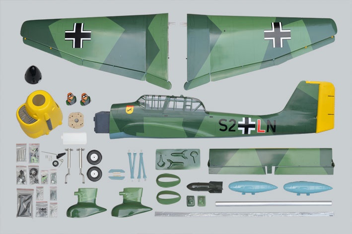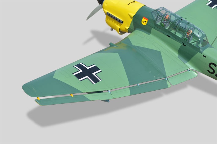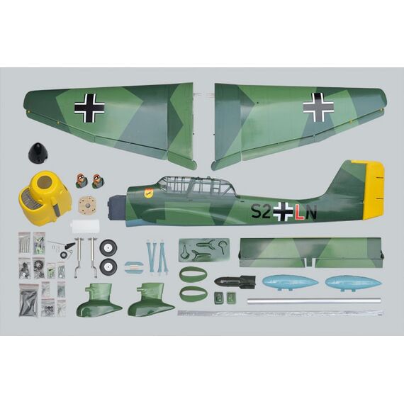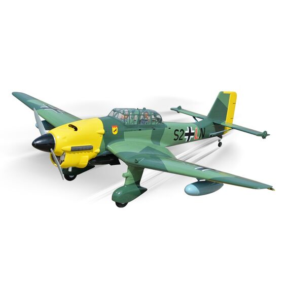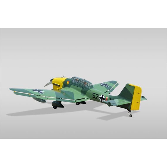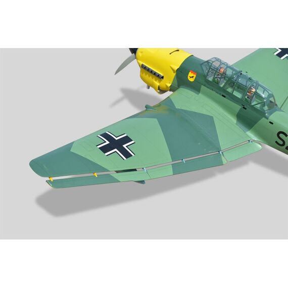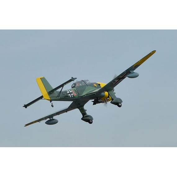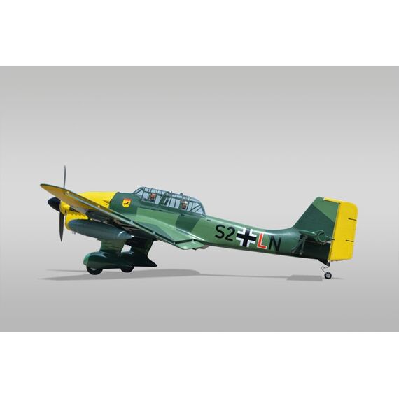 DieSTUKA Ju87 ist ein einmotoriges Kampfflugzeug aus der Zeit des Zweiten Weltkrieges. Es war ein Sturzkampfflugzeug – STUKA -, das mit dem Geheule der Sirenen seinen Sturzflugangriff ankündigte. Die Motorhaube und Radschuhe sind aus GFK gefertigt und fertig lackiert. Der STUKA Ju87 Bomber ist komplett aus Holz hochwertig aufgebaut und mit Original Oracover Folie bespannt. Hervorzuheben sind die vorbildgetreuen Querruder und Landeklappen. Mit den empfohlenen kraftvollen Motoren erreicht das Modell beeindruckende Flugleistung. Das Modell hat ein sehr gutmütiges Flugverhalten, welches auf die Größe, den Knickflügel und der Bauweise als Unterdecker zurückzuführen ist. Konzipiert ist das Modell für einen 20 ccm Verbrennungsmotor oder einen 50 mm Brushless Motor. Der Zugang zum Antriebsakku erfolgt durch die abnehmbare Kabinenhaube. Die STUKA Ju87 ist bis zu 95% vorgefertigt und mit Oracover Folie bespannt, alle Kleinteile, die für den Aufbau benötigt werden, sind im Lieferumfang enthalten.