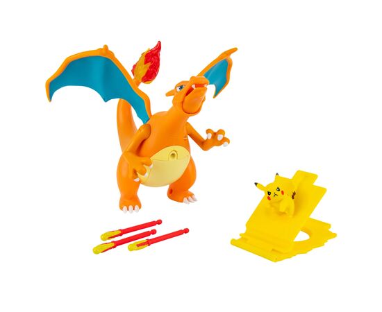 Entfessle die volle Kraft von Glurak dem Flammen-Pokémon mit dieser interaktiven Deluxe Figur die über 50 verschiedene Reaktoinen (Sounds Lichter und bewegliche Funktionen) verfügt. Der 15cm grosse Glurak reagiert unterschiedlich auf Sturzflüge Drehungen und viele andere Kombinationen von actionreichen Flügen. Beobachte wie Dein Pokémon mit verschiedenen Geräuschen und Bewegungen reagiert - genau wie ein echter Feuerdrache! Inkl. Glurak Spielfigur 3 Flammgeschosse 5cm Pikachu-Figur 5cm Figuren-Werfer.