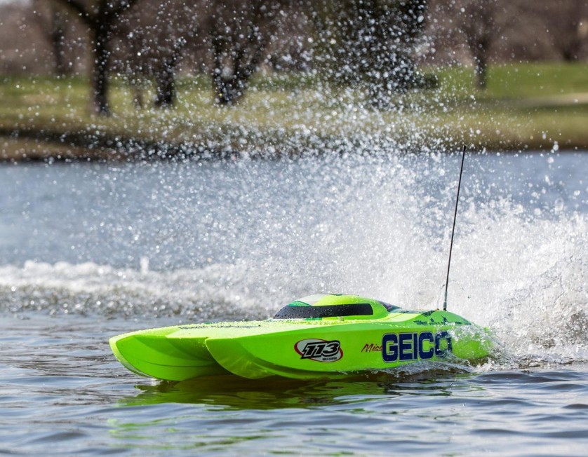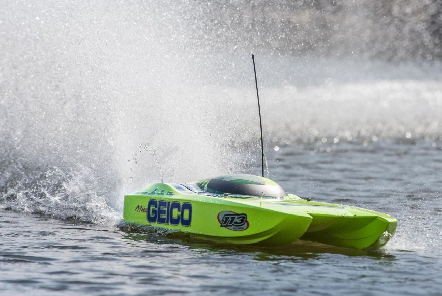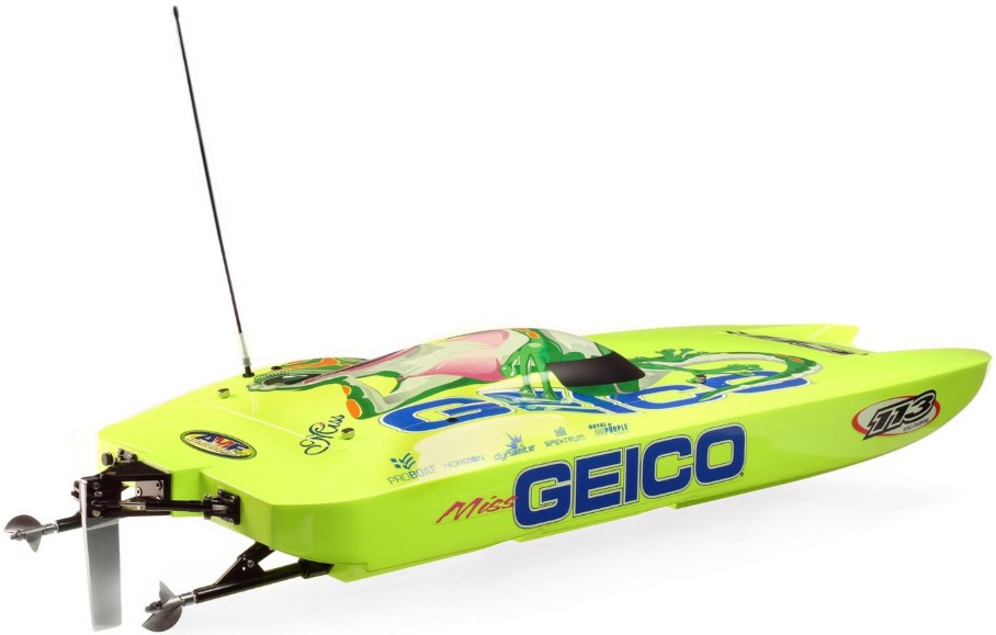 Speed entscheidet alles in der Welt der High-Speed RC Katamarane. Der Pro Boat® Miss GEICO Zelos™ 36 Twin Brushless Katamaran erreicht ab Werk Geschwindigkeiten von über 120km/h** und ist damit eines der schnellsten Boote am Markt. Wenn die Konkurrenz endlich realisiert, was sie da gerade überholt hat liegen sie schon in der Heckwelle deiner beiden gegenläufigen Propeller, welche von zwei bärenstarken 1900Kv 4-Pol 36x74mm Motoren angetrieben werden. Vom Bug bis zum Heck wurde dieser Katamaran mit seinem handlaminierten Rumpf nur für eines gebaut: Nervenzerreißenden SPEED. Hol dir deine Miss GEICO Zelos 36 und erlebe den Geschwindigkeitsrausch, nach dem du dich sehnst.