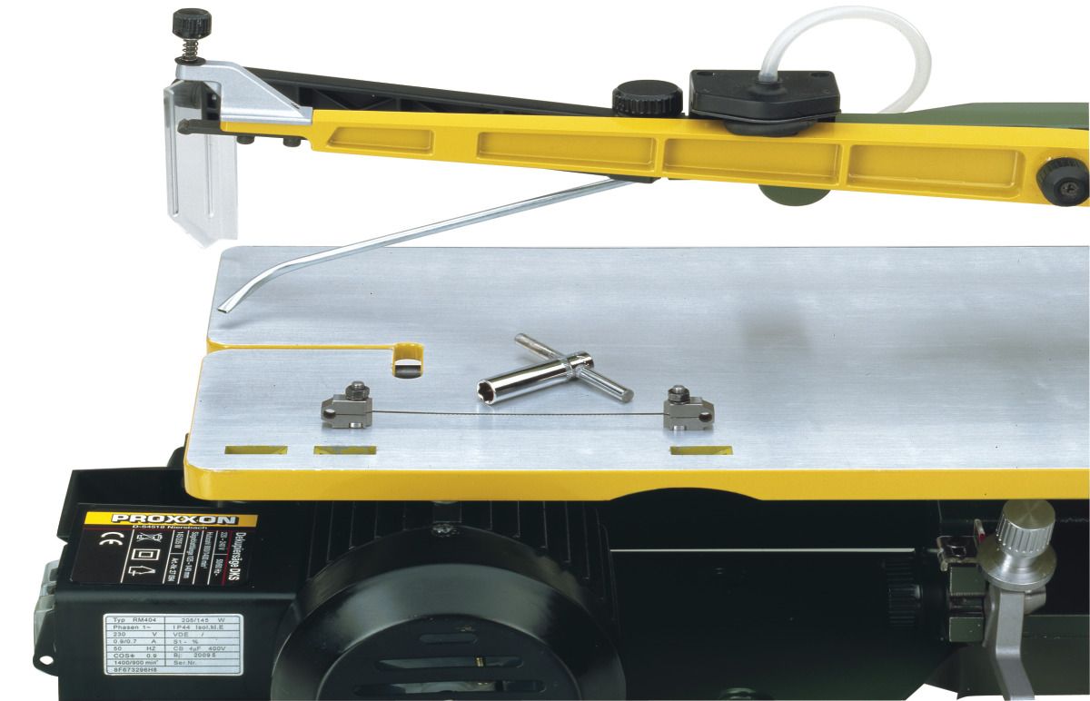 Grosser Sägetisch aus Alu-Druckguss (400 x 250 mm). Kann zum Erleichtern des Sägeblattwechsels entriegelt und nach hinten verschoben werden. Normale Feinschnitt-Sägeblätter werden durch Kulissensteine mit hoher Spannkraft befestigt: für extrem genaues Fluchten. Die Maschine ist auch für Sägeblätter mit Querstift vorgerüstet, die ohne Kulissensteine eingesetzt werden. Für Dekupiersägen dieser Bauart extrem wichtig: Ein handlicher Drehknopf ermöglicht gefühlvolles Spannen der Sägeblätter!