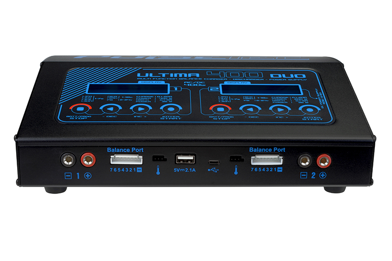 Der ULTIMA 400 DUO kann 2 beliebige Lithium-Batterien von 1 bis 7S, Nickel-Batterien von 1 bis 18 Zellen oder PB-Batterien von 2 bis 24V gleichzeitig laden.