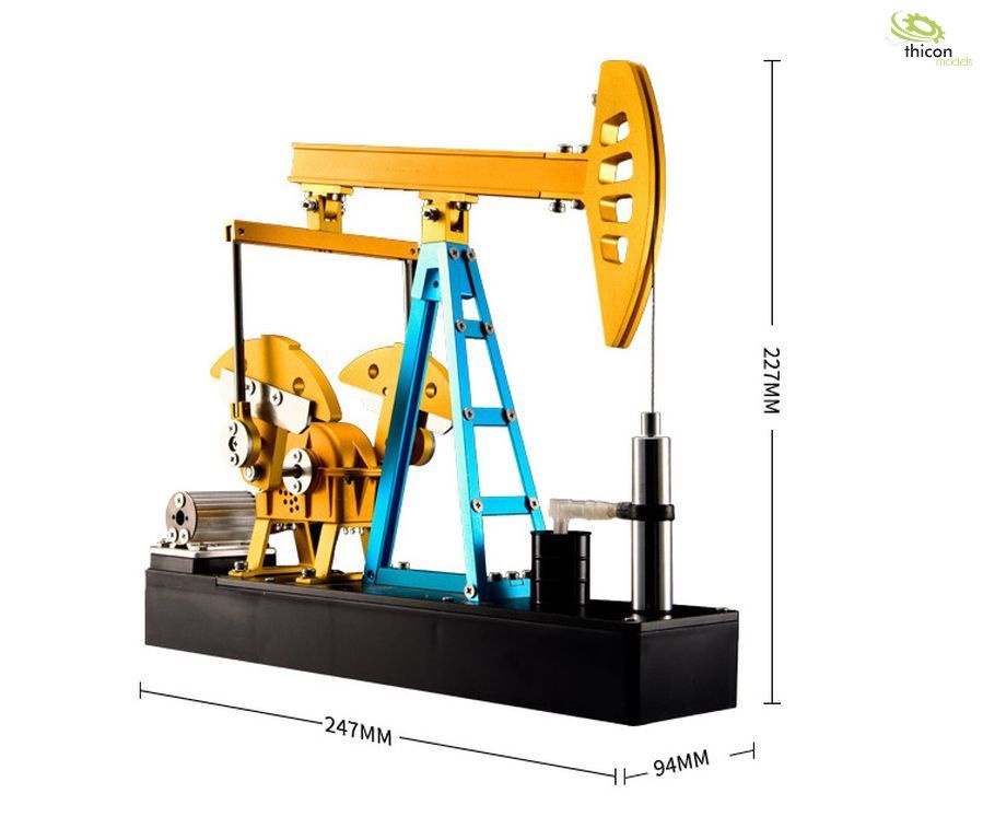 Hochwertiger Metallbausatz einer Pumpstation. Die Pumpe besteht aus ca. 219 Einzelteilen und kann nach der Montage als Dekomodell mit beweglichen Pumparm verwendet werden. Die Pumpe kann sogar Wasser fördern. Im Untergestell ist ein Wassertank untergebracht. Das Wasser wird dann durch die Hubbewegung nach oben gefördert. Ideal als beeindruckende Deko für jeden Schreibtisch oder Wohnzimmerschrank. Eine interne Elektronik mit Elektromotor, Akku und Ladegerät ermöglichen eine Betriebsdauer von ca. 30 Minuten. Das Laden erfolgt über einen USB-Anschluss.