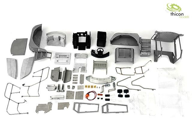 Das Set beinhaltet alle Kabinenteile, Motorhaube, Geländerteile und Trittstufen aus Metall.