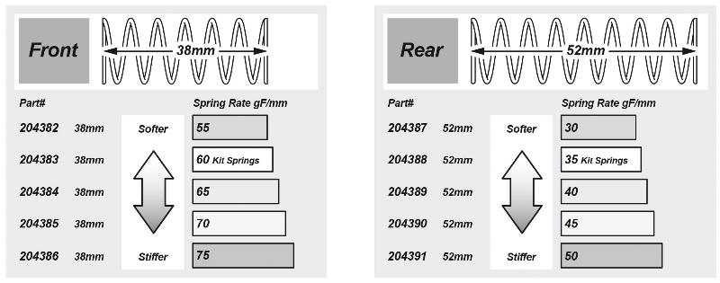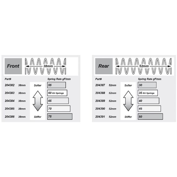 These option springs for the D418 1/10 buggy let racers fine tune the suspension stiffness for optimal performance. Each spring in tagged with the gF/mm for easy identification. Sold in pairs.