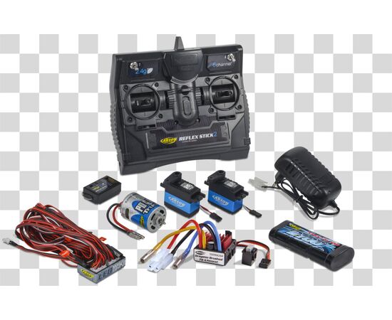 6-Kanal, 2.4G Sender, 1x Servo CS6, 1x Servo CS3, LED Truck Light, Truck Regler, Truck Motor, Expert Charger 1A, 7,2V Akku 2100 mAh, Anleitung.