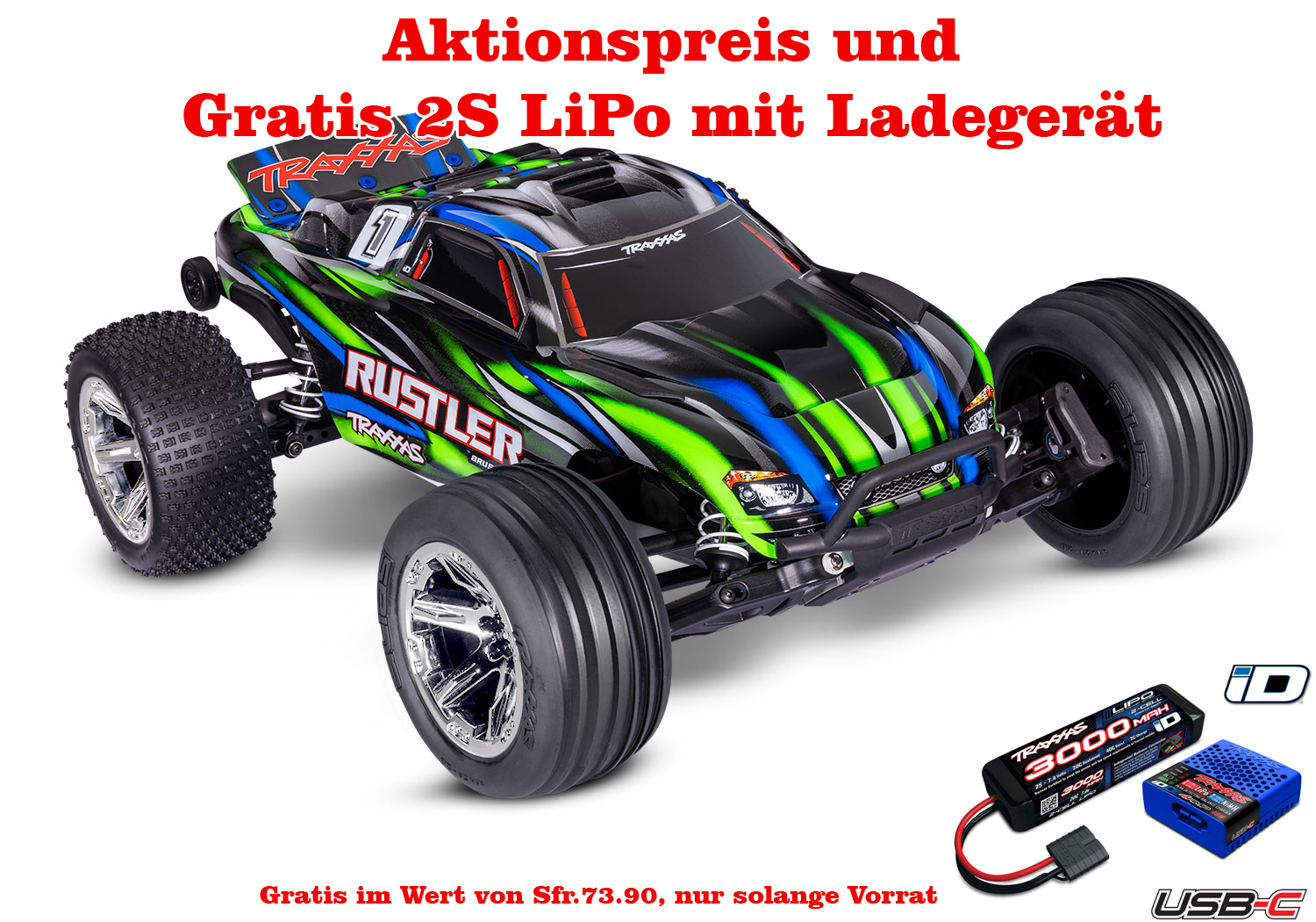 Aktion Traxxas Rustler 1:10 2WD RTR grün BL-2S inkl. Lipo Akku und Ladegerät