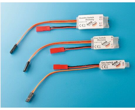 Der Schaltbaustein wird direkt an einen Empfängerausgang einsteckt. Damit kann jeder freie Kanal am Sender zum Schalten von Verbrauchern im Modell verwendet werden. Alle Varianten sind einbaufertig verdrahtet - nur noch eine Stromquelle bis maximal 30 V und die zu schaltenden Verbraucher anschließen. Die Serie beginnt mit dem Uno Switch und einer Schaltfunktion, über den Duo Switch mit zwei Ausgängen bis hin zur Quadro Switch mit 4 getrennt schaltbaren Verbrauchern an einem Kanal. Die Versionen Duo- und Quadro Switch mit mit eine Memoryfunktion ausgerüstet. Dies bedeutet, dass der Verbraucher bei einmaliger Betätigung des Propkanals oder Schalters am Sender den Verbraucher eingeschaltet und solange mit Strom versorgt bis ein weiteres betätigen des Knüppels/Schalters die Funktion wieder ausschaltet.