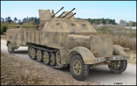 Das Sd.Kfz. 7 - Mittlerer Zugkraftwagen 8 t - war eine der bekanntesten Zugmaschinen der deutschen Wehrmacht im zweiten Weltkrieg. Das Halbkettenfahrzeug wurde vor allem als Artilleriezugmaschine für schwerere Geschütze eingesetzt. Eine weitere Variante war das Sd.Kfz. 7/1 mit einer aufgesetzten 2 cm Vierlingsflak 38. Für den Munitionstransport wurde ein Sd.Ah. 52 mitgeführt. Die Besatzung sollte durch eine gepanzerte Fahrerkabine besser geschützt werden. Zur Abwehr der stetig wachsenden Bedrohung durch alliierte Flugzeuge, wurden immer mehr mechanisierte Truppenteile mit diesen Selbstfahrlafetten ausgestattet.