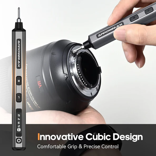 Unser Mini-Schraubendreher wurde mit Fokus auf Komfort und Bedienbarkeit entwickelt. Das innovative, würfelförmige Design bietet einen angenehmen Griff und bessere Kontrolle beim Schrauben – im Gegensatz zu herkömmlichen zylindrischen Modellen. Über das integrierte OLED-Display behalten Sie wichtige Informationen stets im Blick. Zusätzlich sorgt das integrierte schattenfreie LED-Licht für optimale Ausleuchtung Ihres Arbeitsbereichs.