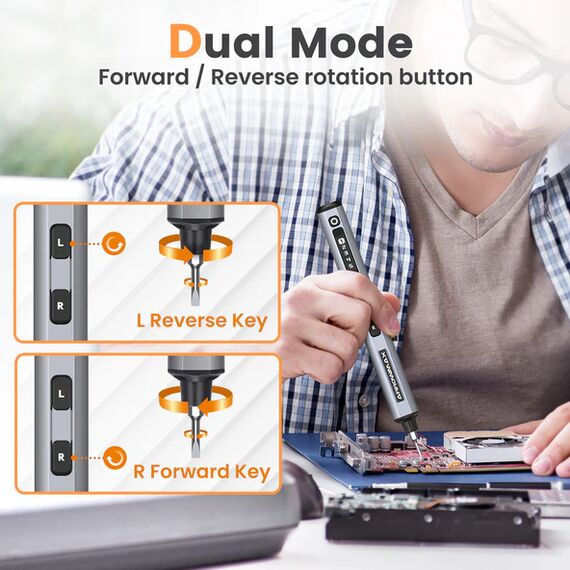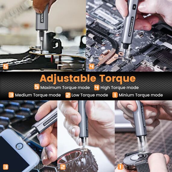Mit 5 einstellbaren Drehmomentstufen und der Möglichkeit, die Drehrichtung umzukehren, passt sich unser Präzisions-Schraubendreher-Set perfekt an Ihre Anforderungen an. Wählen Sie das ideale Drehmoment (von 0,1 bis 0,5 Nm) für jede Aufgabe. Die niedrige Drehmomentstufe schützt empfindliche Bauteile vor dem Überdrehen, während die hohe Stufe für eine sichere und feste Verschraubung sorgt (maximales elektrisches Drehmoment: 5,0 kgf·cm). Dank der Umschaltfunktion können Schrauben mühelos angezogen oder gelöst werden.