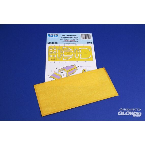 Vorgeschnittene Maskierfolie für Klarsichtteile und Räder des Modellbausatzes SF-260 in der Variante mit großer Kabinenhaube.
