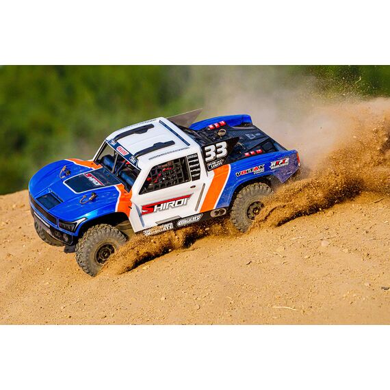 Der SHIROI ist nicht nur schnell - er sieht dabei auch richtig gut aus! Vom detailgetreuen Überrollkäfig im Innenraum über den Dachgepäckträger bis hin zu realistischen Front- und Heckstoßfängern - jedes Detail wurde so gestaltet, dass es dem echten Short Course Racing nachempfunden ist. Die vorgeschnittene Karosserie mit aggressivem Styling und offenen Radläufen verleiht dem SHIROI seinen unverkennbaren Offroad-Charakter. Die speziell entwickelten Mudclaws SC-Reifen auf schwarzen Mehrspeichenfelgen bieten starken Grip und einen maßstabsgetreuen Look - ob auf Schotter, Dreck oder in der Luft.