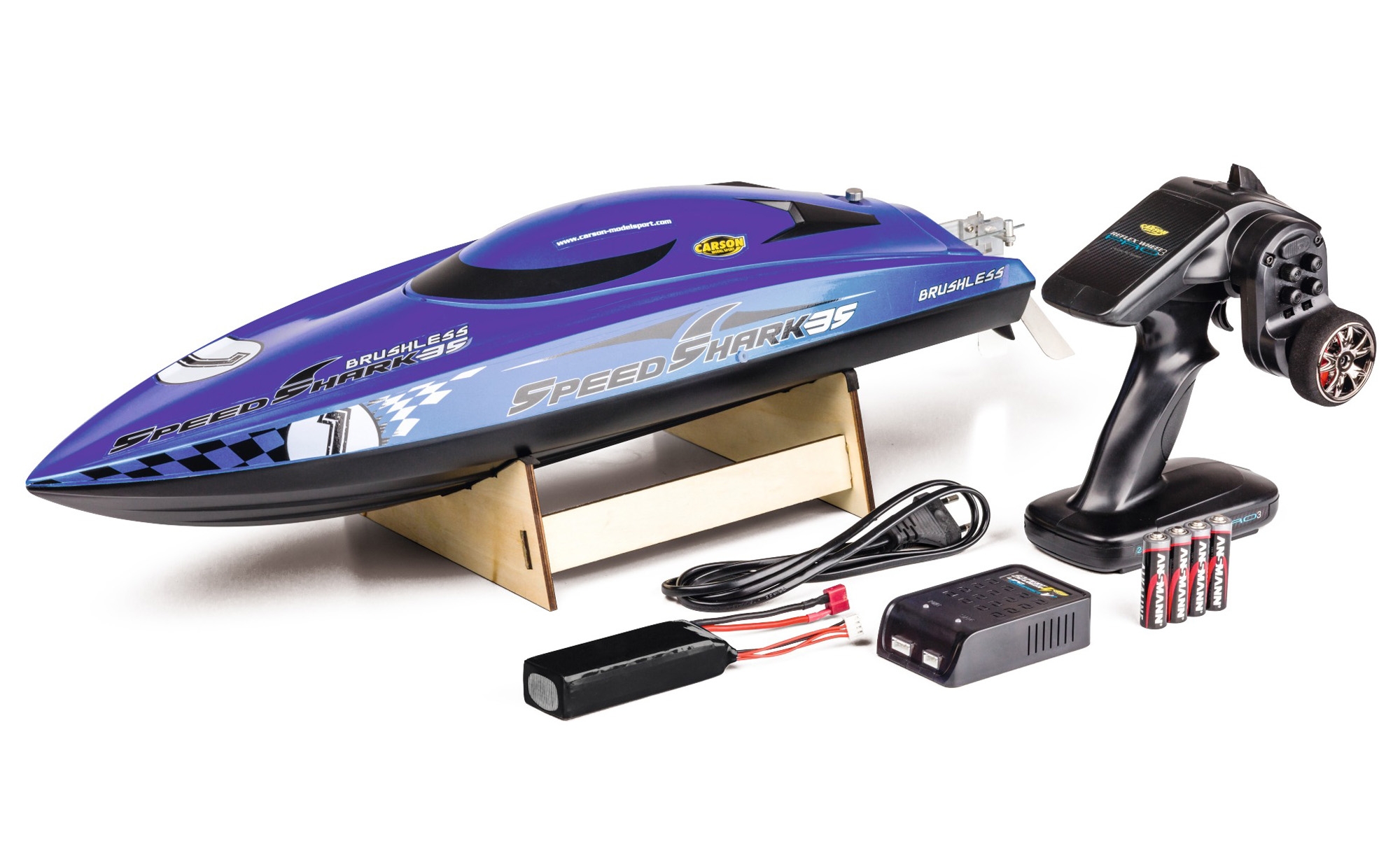 Fahrfertiges Modell, 2.4 GHz Fernsteueranlage, LiPo Fahrakku 11,1V/2500mAh, Ladegerät, 4x Senderbatterien LR6/AA, Bootsständer,