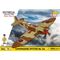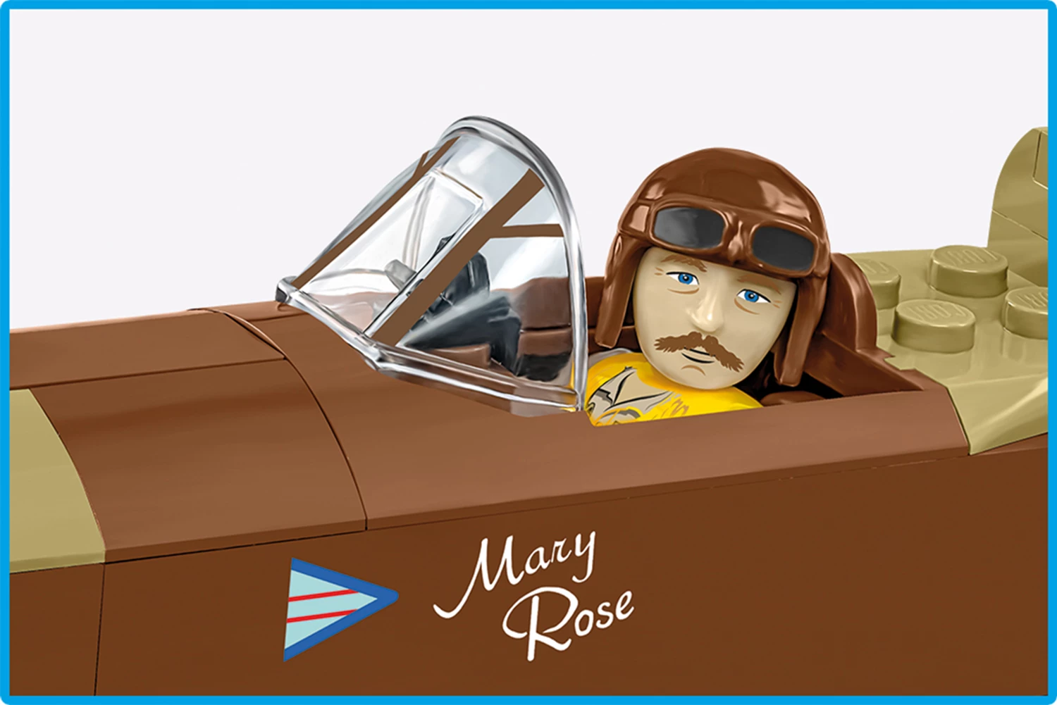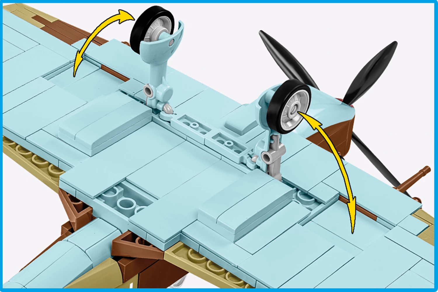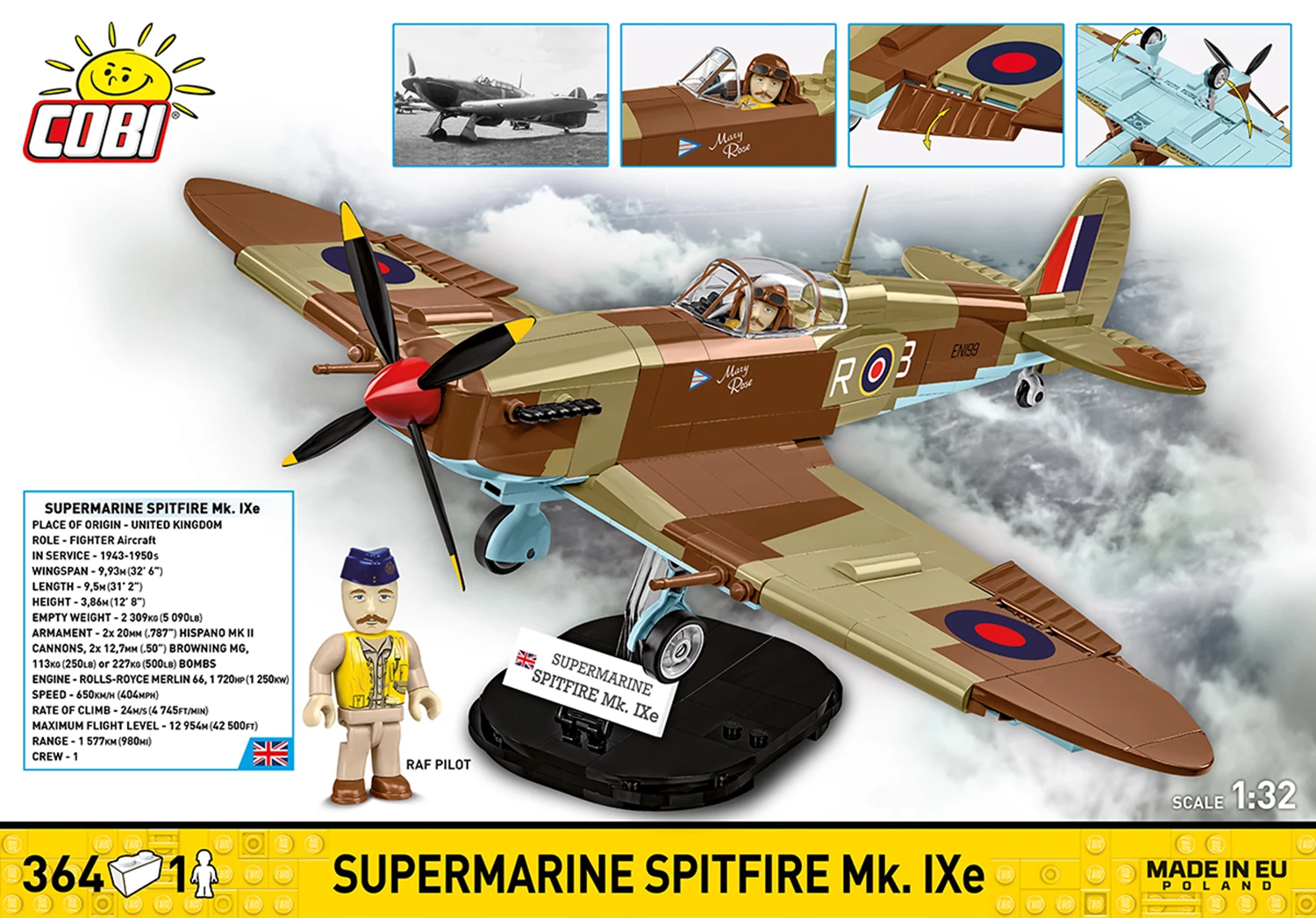 Britisches Einsitzer-Jagdflugzeug, das während des 2. Weltkriegs eingesetzt wurde. Eine verbesserte Variante des Supermarine Spitfires Mk. V. Die Version IX verbesserte man u.a. um ein neues Gyroskop-Zielfernrohr Mk II, einen neuen Typ des E-Flügels und zwei zusätzliche Treibstoffbehälter im hinteren Teil des Rumpfs. Durch Zufall entstand eine Version, die später als die beste von allen Spitfires bezeichnet wurde. Modell mit einklappbarem Fahrwerk, beweglichen Querrudern und abnehmbarem Kabinendach. 364 Teile, 1 Figur, Stütze aus Bausteinen, bedruckte Blöcke, bewegliche Elemente. Modellmasse (LxBxH): 28 x 35 x 12 cm