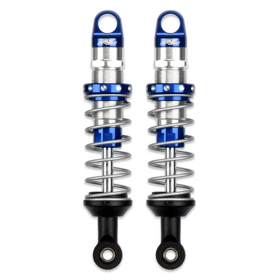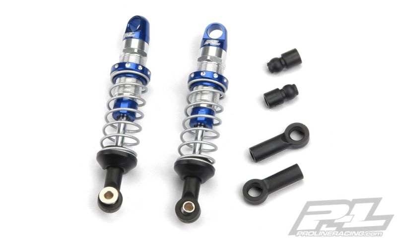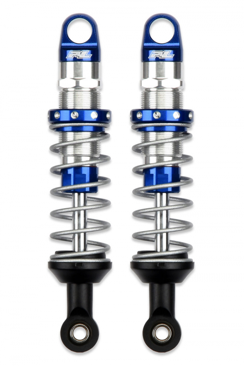This is a pair of Pro-Spec Scaler Shocks. Pro-Line is proud to announce the next generation of RC Shock Technology with our all-new Pro-Spec Scaler Shocks! The new Shocks feature CNC machined Aluminum Shock Caps, Collars, Bodies, Bottom Caps and Hard Chrome Coated Steel Shock Shafts all made to exacting tolerances. X-Ring seals are used as the main shaft seal for smooth, low friction action and to prevent leaks. Just like Pro-Line's other Pro-Spec Shocks, the new Scalers are meant to stand out from the crowd with bright Chrome and Blue anodizing. From the top mounting hole to the bottom mounting hole these Pro-Spec Scaler Shocks measure out to be 70mm at full extended length and collapse down to about 54mm and they include extra 5mm longer Shock Ends to increase the shock length! These short shocks are perfect for super scale rigs! Just like Pro-Line's extremely popular PowerStroke Shocks, the Pro-Spec Scaler Shocks come mostly pre-built (just add oil) and are designed to fit on many popular crawler vehicles.
