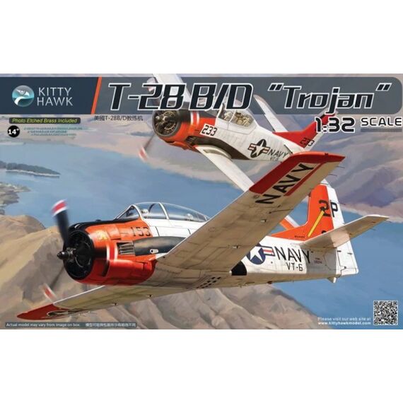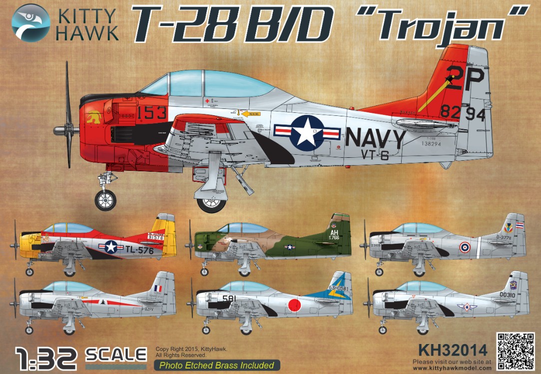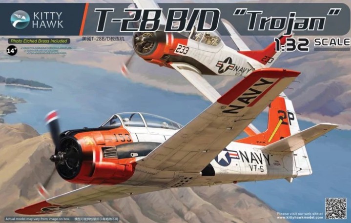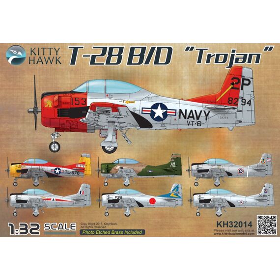 Besides its use as a trainer, the T-28 was successfully employed as a counter-insurgency aircraft, primarily during the Vietnam War. Kit features surface detail, highly detailed tandem cockpits, detailed Wright R radial engine, optional speed brake, hinged elevators, detailed wheel wells and optional undercarriage, optional canopy, separate propeller blades, armament (bombs, rockets, drop tank and machine gun pods ), photoetch (seatbelts, engine accents).