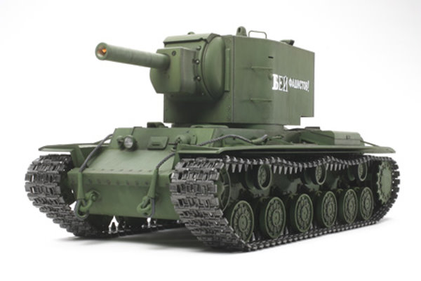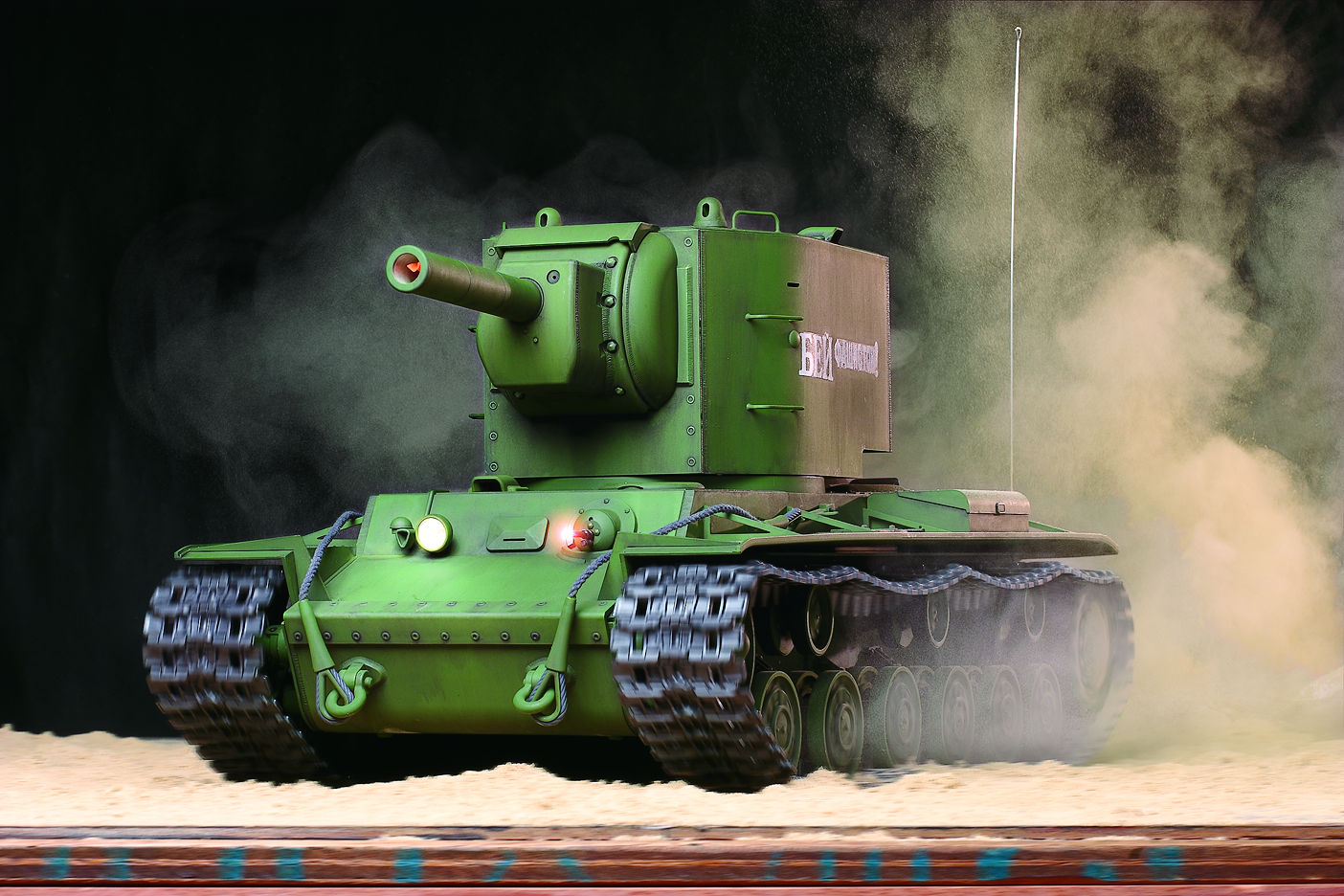 Der mit zahlreichen funktionellen Baugruppen ausgestattete Modellpanzer verfügt dank seiner elektronischen Steuereinheit über aussergewöhnlich realistische Bewegungs- und Soundeffekte. Motor- und andere Geräusche wurden an Originalpanzern aufgenommen, um eine perfekte Simulation zu gewähren. Der vorbildgetreue Geschützturm lässt sich per Fernsteuerung drehen und ausrichten. Der Modell KV-2 vollführt sogar die kettenfahrzeugtypische Drehung auf der Stelle. Für hohe Detailtreue des "Giganten" von TAMIYA sorgen u. a. Fotoätzteile und zahlreiche nachgebildete Details, wie die Abschleppseile.