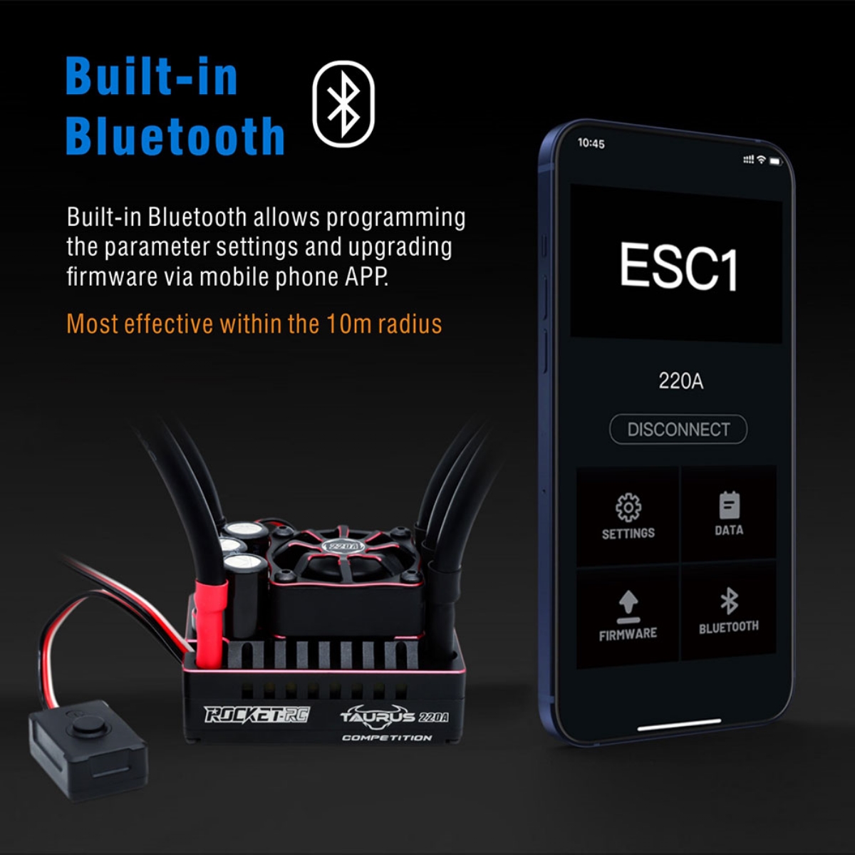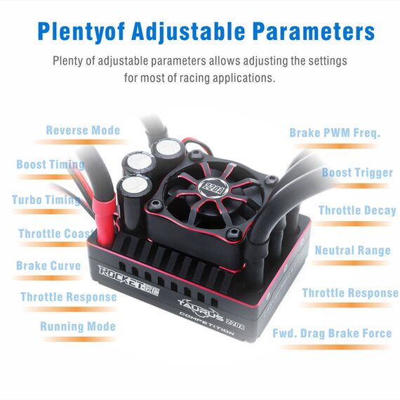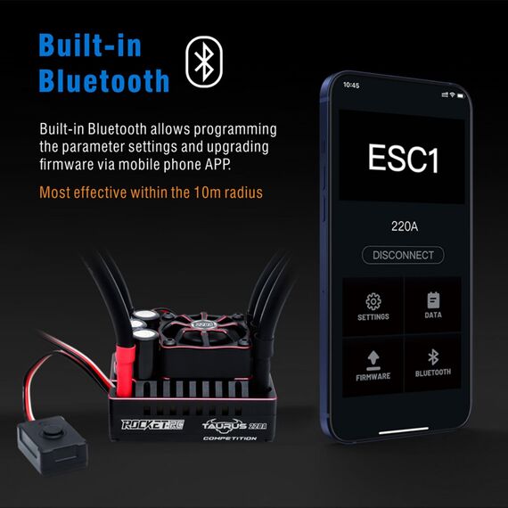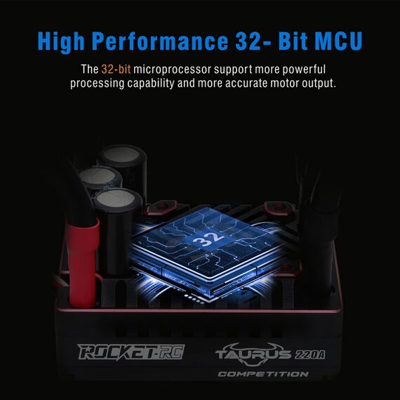 Entdecken Sie den neuen elektronischen Wettbewerbsregler für 1:8-Fahrzeuge, den Taurus 220A!//////Sein 32-Bit-Prozessor, der eine höhere Verarbeitungsleistung und eine feinere Steuerung der Motoren bietet.//////Optimiertes Ansprechverhalten des Gaspedals für eine flüssige Beschleunigung, hohe Linearität und hervorragende Fahrleistungen.//////Kürzlich aktualisierte Software, die deutliche Verbesserungen der Gaspedalreaktion enthält und eine erstklassige Beschleunigung und lineares Fahrverhalten gewährleistet.//////Anpassbare Anpassungen der Gaspedalkurve und der Stanzintensität für ein maßgeschneidertes Erlebnis.//////Dynamische Konfiguration des Boosts und Feinabstimmung des Turbo-Timings für optimierte Leistung.//////Individuelle Anpassung der Bremskurve und Anpassung der Bremsintensität für volle Kontrolle.//////Kontinuierliche Aufzeichnung der Nutzungsdaten für eine Überwachung in Echtzeit.//////Erweiterter Schutz mit mehreren Sicherheiten: Beinhaltet Schutz vor Niederspannung, Überhitzung und Verlust des Gaspedalsignals.//////Integrierte Bluetooth-Konnektivität für die einfache Programmierung von Einstellungen und Firmware-Updates über eine mobile App.//////Download der ESC1-App verfügbar im Apple iOS App Store und für Android-Nutzer über eine spezielle Handhabung unter 'Sicherheit und Datenschutz'.//////Technische Spezifikationen ://////Empfohlene Verwendung: 1/8-Rennwagen On-Road und Off-Road Buggy/Truggy.///Robustes Aluminiumgehäuse mit optimiertem Design für die Wärmeableitung.///Kompatible Eingangsspannung: 2-4s Lipo.///Dauerstrom: 220 A///Spitzenstrom: 1000 A///BEC-Ausgang: 6 A, einstellbar auf 6 V oder 7,2 V.///Gewicht: 155 g///Abmessungen: 55,2 mm x 40,2 mm x 36,5 mm.///Wasserdicht: Nicht wasserdicht//////