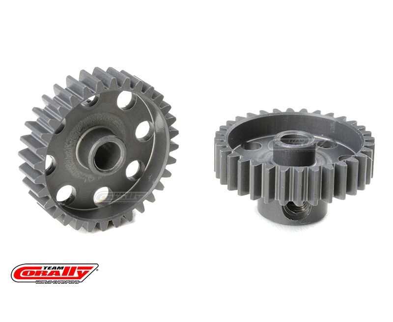 High-strength 32T pinion gear made from tough 7075 T6 alu and specially hardcoated for superior strength, light weight, and high durability. Created on a special gear machine, all pinions feature ultra-precise tooth shaping and ultra-true running for vibration-free operation. Each pinion is marked with the tooth number for easy and quick identification.