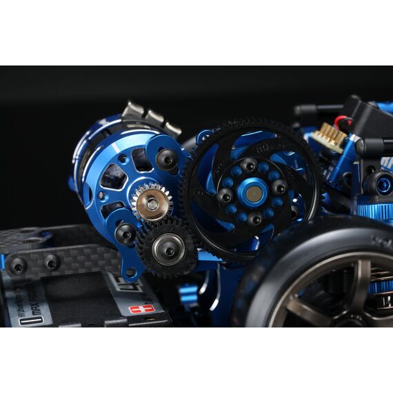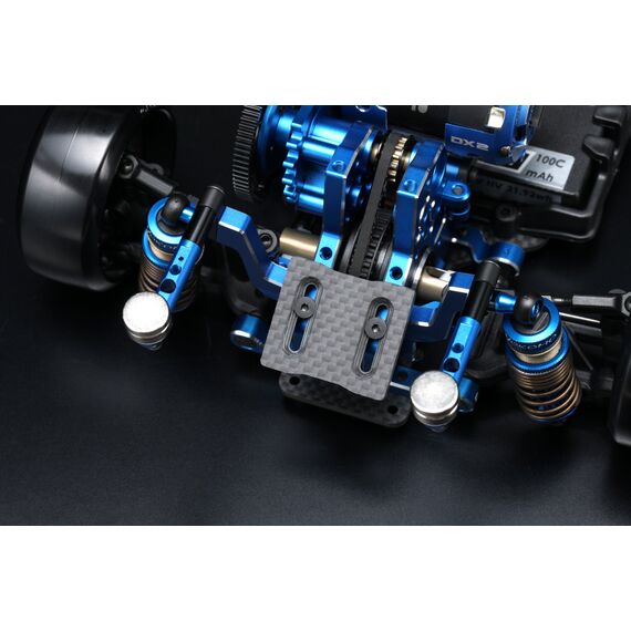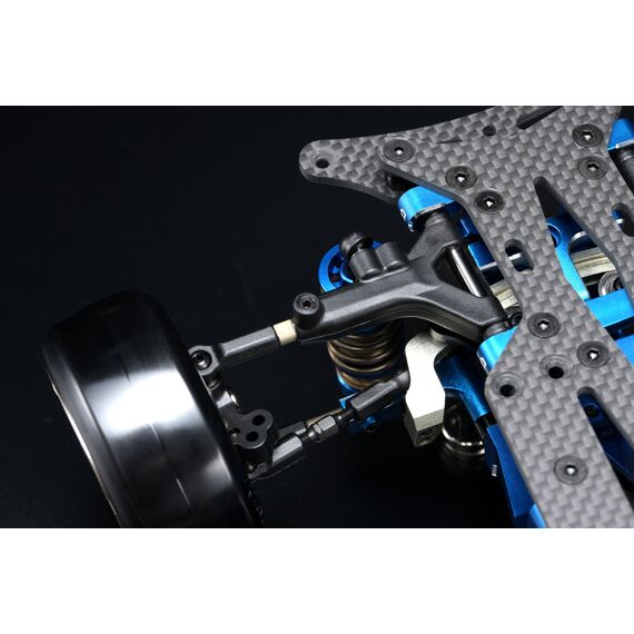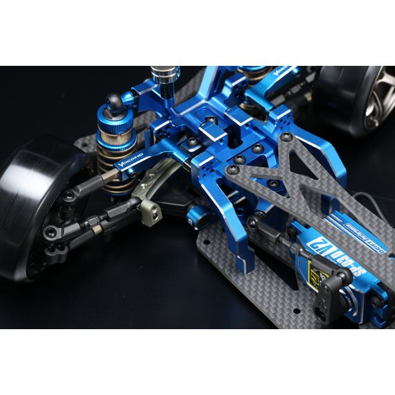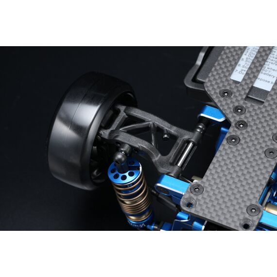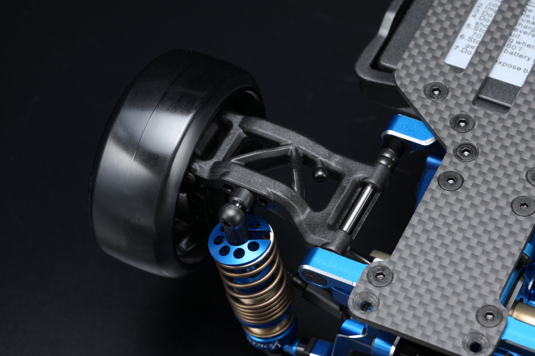 Das Fahrwerk ist auf Anpassungsfähigkeit ausgelegt und nutzt eine H-Arm-Aufhängung mit Stiftbefestigung, die mit den traditionellen A-Arm-Konfigurationen früherer MD-Modelle kompatibel ist. Diese Doppelkonfiguration ermöglicht es dem Fahrer, das Fahrzeug an die Streckenbedingungen oder persönliche Vorlieben anzupassen. Yokomo plant außerdem, die Kompatibilität mit zukünftigen optionalen Teilen zu erweitern, um den MD3.0 zu einer flexiblen Plattform für individuelle Anpassungen zu machen. Harz-Aufhängungsarme sind serienmäßig, für mehr Präzision und Reaktionsfähigkeit können jedoch auch Graphit-Versionen eingesetzt werden.