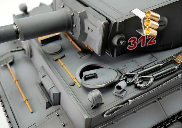 Das kraftvolle Paket verfügt über eine 2.4 GHz Steuerung. Die Motoren mit optimiertem Drehmoment verleihen dem Tiger I eine präzise, ruckelfreie Fahrt. Metallgetriebe mit robusten Zahnrädern und einer verbesserten Übersetzung sorgen für höhere Kraft. Durch die proportionale Steuerung können Sie den Panzer ganz langsam anfahren und die Geschwindigkeit stufenlos erhöhen. Der Tiger I fährt vorwärts und rückwärts, auch jeweils mit einer Links- und Rechtsdrehung. Ebenso lässt er sich auf der Stelle links- bzw. rechtsherum drehen. Sie können die Kanone heben und senken und den Geschützturm um 360 Grad drehen. Verschiedene Motorengeräusche und die Rauchbildung aus den Auspufftöpfen runden das realitätsnahe Erlebnis ab.