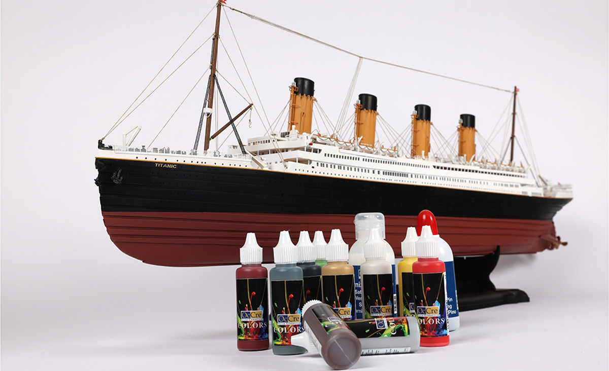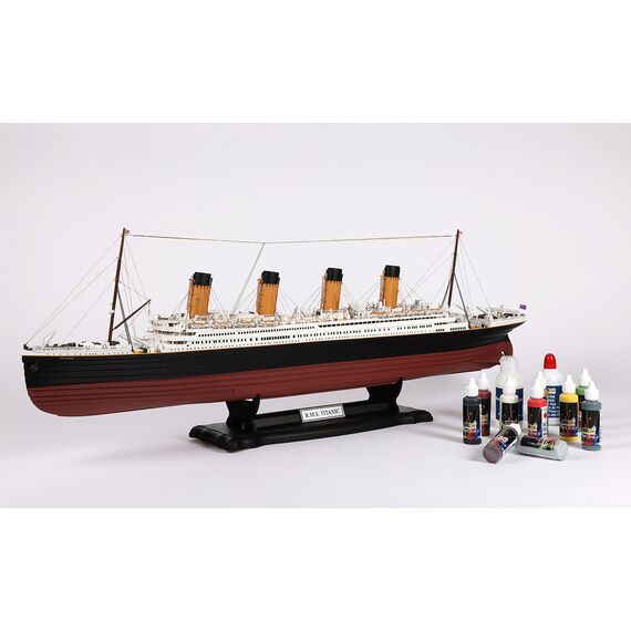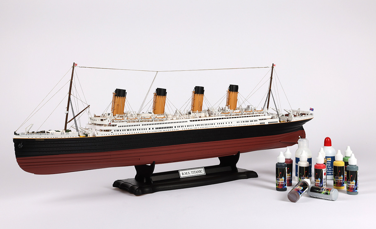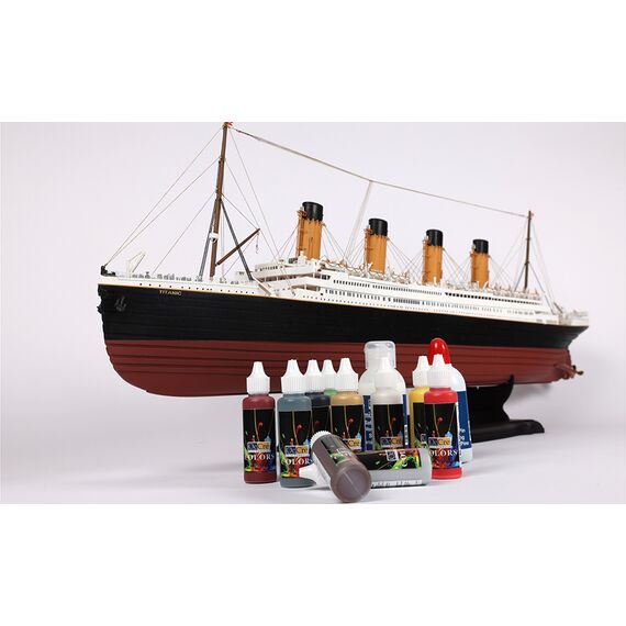 The pack includes the colors, tints and varnish necessary for the perfect finishing of the Titanic.