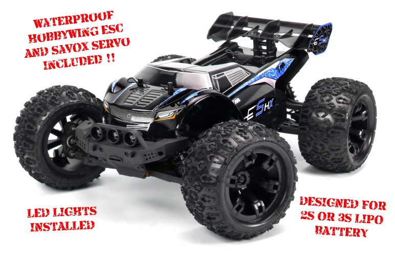 Der E5 ist der derzeit schnellste und stärkste 1:10 Monster Truck auf dem Markt. Der vordere Rammer ist mit drei weissen und zwei roten hellen LED's ausgestattet. Der Team Magic E5 beinhaltet eine schön geformte Pickup Monster Truck Karrosserie aus widerstandsfähigem Polycarbonate-Lexan um die innenliegenden Komponenten zu schützen. Robuste 14mm Radadapter helfen die hohe Kraftübertragung auf die griffigen K-Factory Reifen zu gewährleisten für bessere Fahreigenschaften und schnellere Beschleunigung auf allen Untergründen. Desweiteren haben wir ein einstellbares, robustes Wheelie-Bar (Stützrad) am hinteren Ende des Modells angebracht. Für eine bessere Kontrolle der Wheelies (Wheelie = auf zwei Rädern fahren), verfügt der Team Magic E5 über ein kugelgelagertes Wheelie-Rad. Sie werden es lieben!