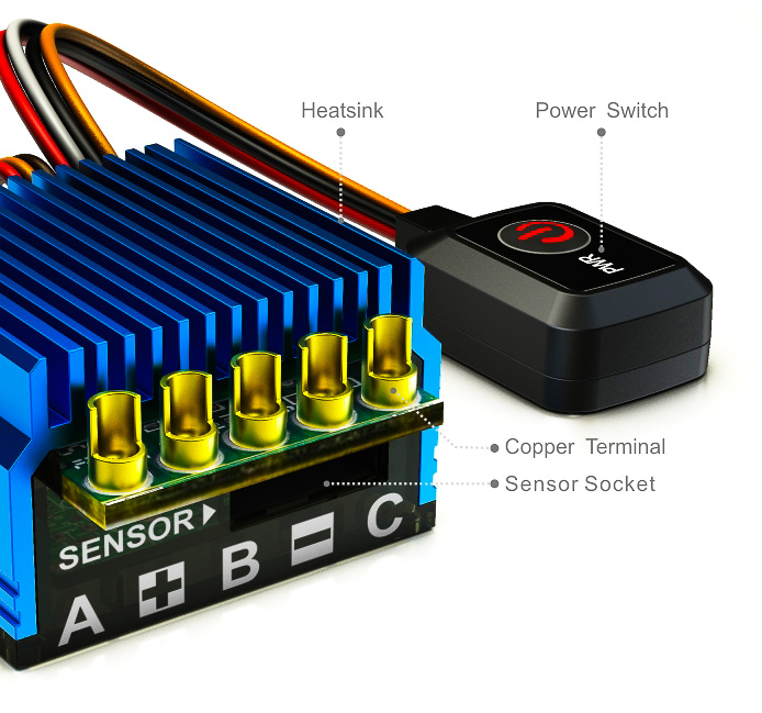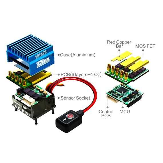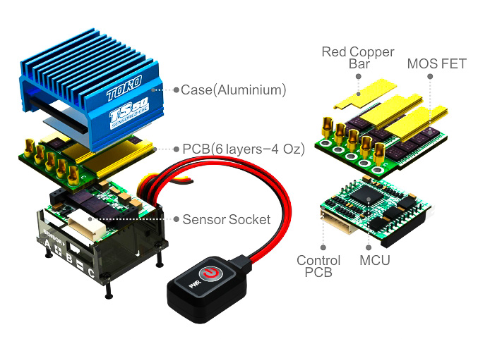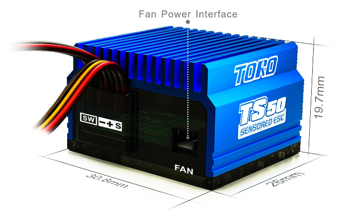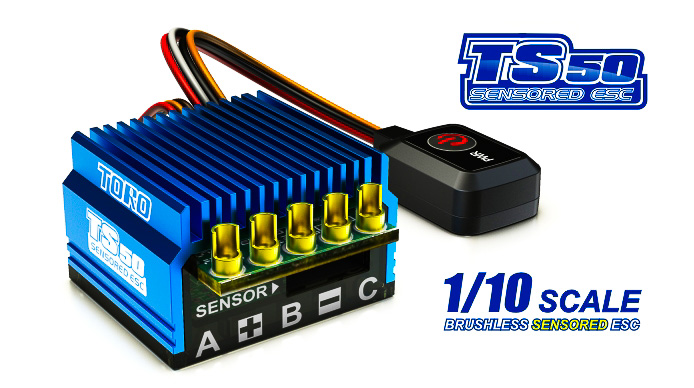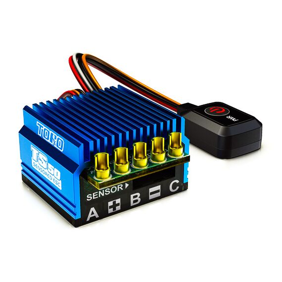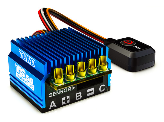 Der Toro 50 Sensored Fahrtenregler ist schön kleine, sehr leicht und besitzt einen elektronischen Schalter. Entwickelt für 1/10 Buggy und Tourenwagen Modelle, ist er aber auch im Scale Bereich einsetzbar. Er verträgt 4-6 NiMH Zellen oder bis zu 2S LiPo's, zudem verfügt der Regler über ein 6V/2A BEC.