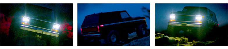 The new LED Light Kit (#8035) takes scale realism to the next level with working headlights, tail lights, and side markers. Fully waterproof and built Traxxas-Tough, the LED light kit is ready for your wildest adventures. No matter where the trail leads, day or night, the TRX-4 Ford Bronco will blaze a trail.