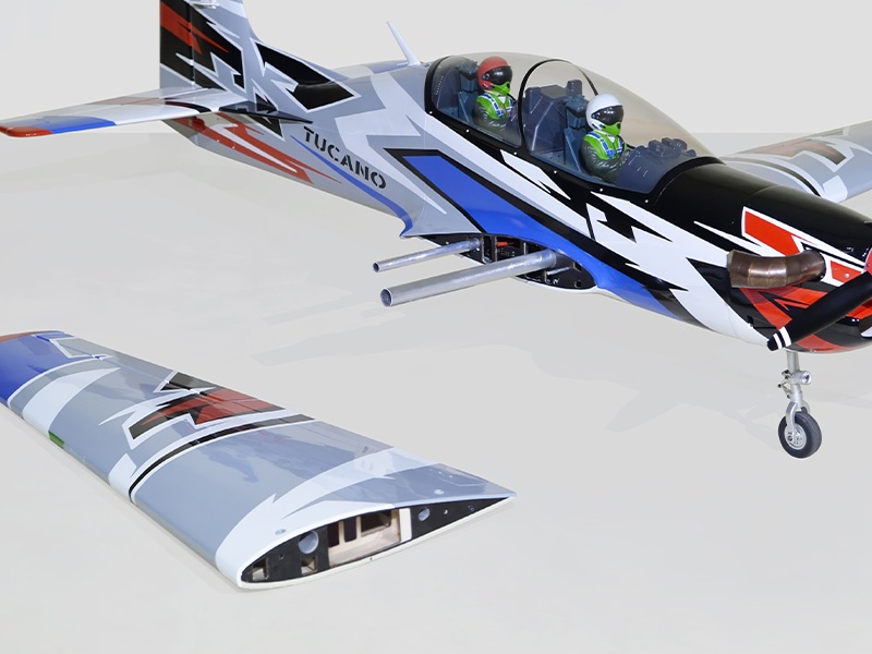 Die Tucano hat extra große Flügel und eine enorm feste Konstruktion. Die Größe der Steuerflächen und das richtige Heckmoment sorgen für überragende Flugeigenschaften, einen großen Geschwindigkeitsbereich und präzise Kunstflugfähigkeiten. Die funktionsfähigen Landeklappen garantieren langsame Flüge und einfache Landungen.