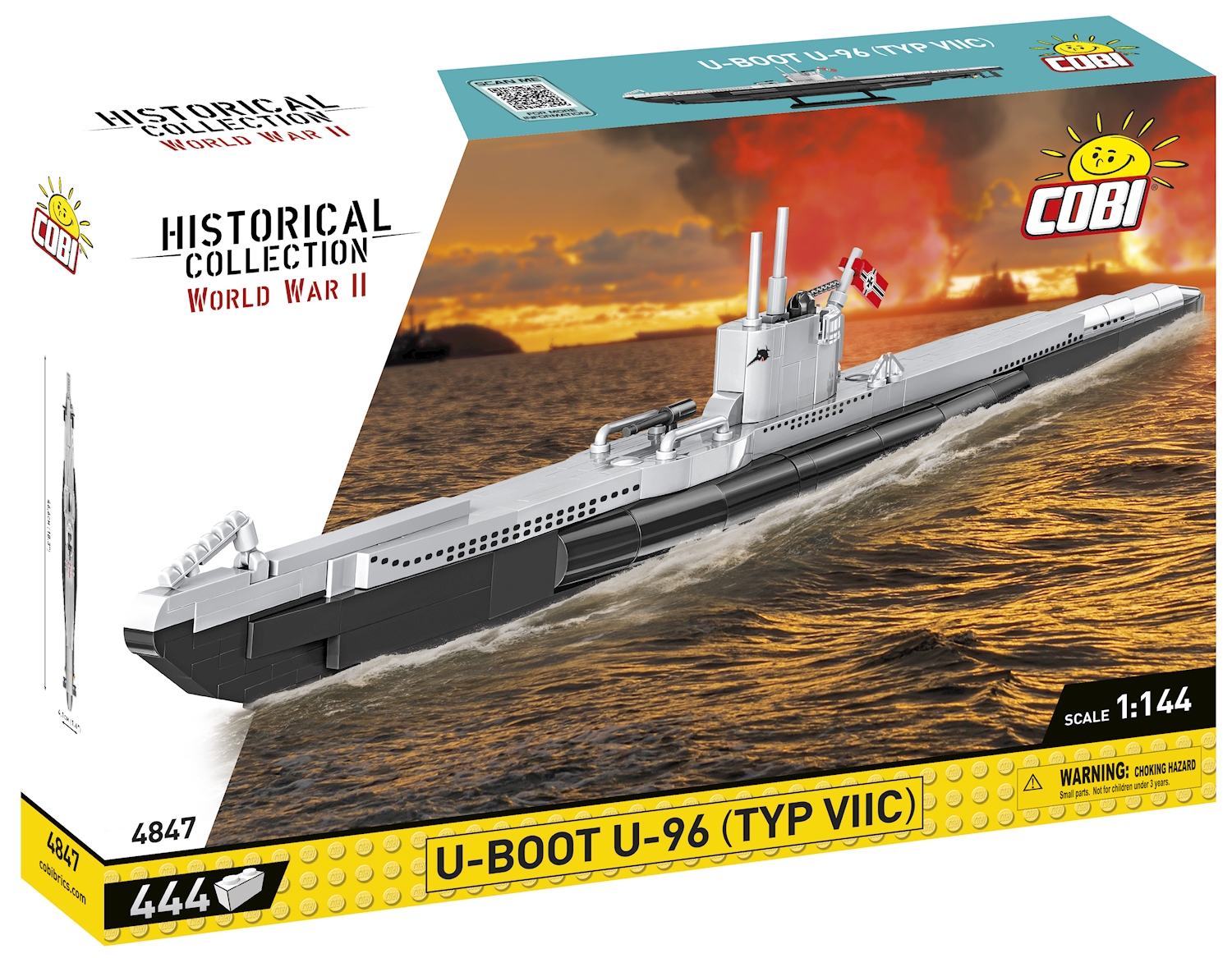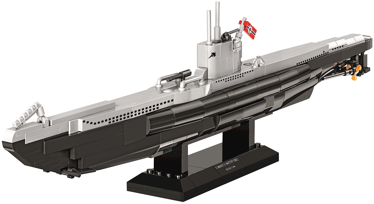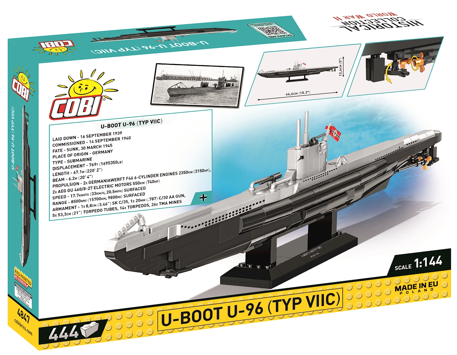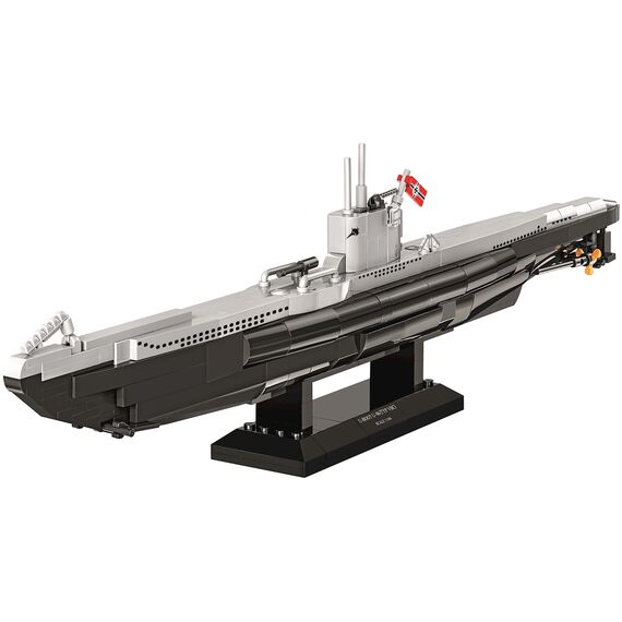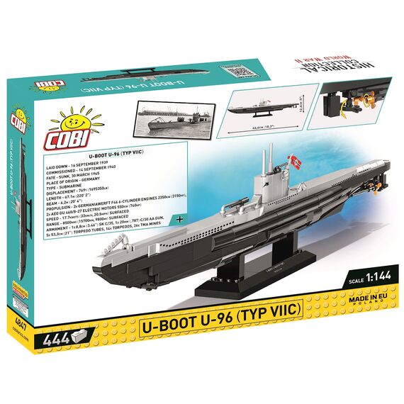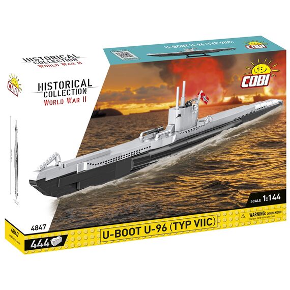 U 96 war ein U-Boot des Typs VII C der deutschen Kriegsmarine während des 2. Weltkriegs und erlangte zusätzliche Berühmtheit durch den Roman von Lothar-Günther Buchheim 'Das Boot' sowie dessen Verfilmung von 1981, denen es mutmasslich als Vorlage diente. U 96 wurde am 14. September 1940 unter dem Kommando von Kapitänleutnant Heinrich Lehmann-Willenbrock in Dienst gestellt. Auf seinen 11 Feindfahrten versenkte das Boot insgesamt 29 Schiffe mit 178'651 BRT und beschädigte weitere 4 Schiffe mit 33'000 BRT. Es wurde am 15.02.1945 in Wilhelmshaven ausser Dienst gestellt und am 30. März desselben Jahres bei einem Bombenangriff durch Einheiten der 8. Luftflotte der USAAF zerstört. Modell mit 444 Teilen, bedruckten Blöcken und beweglichen Teilen. Modellmasse (LxBxH): 46.6 x 4.8 x 12.6 cm