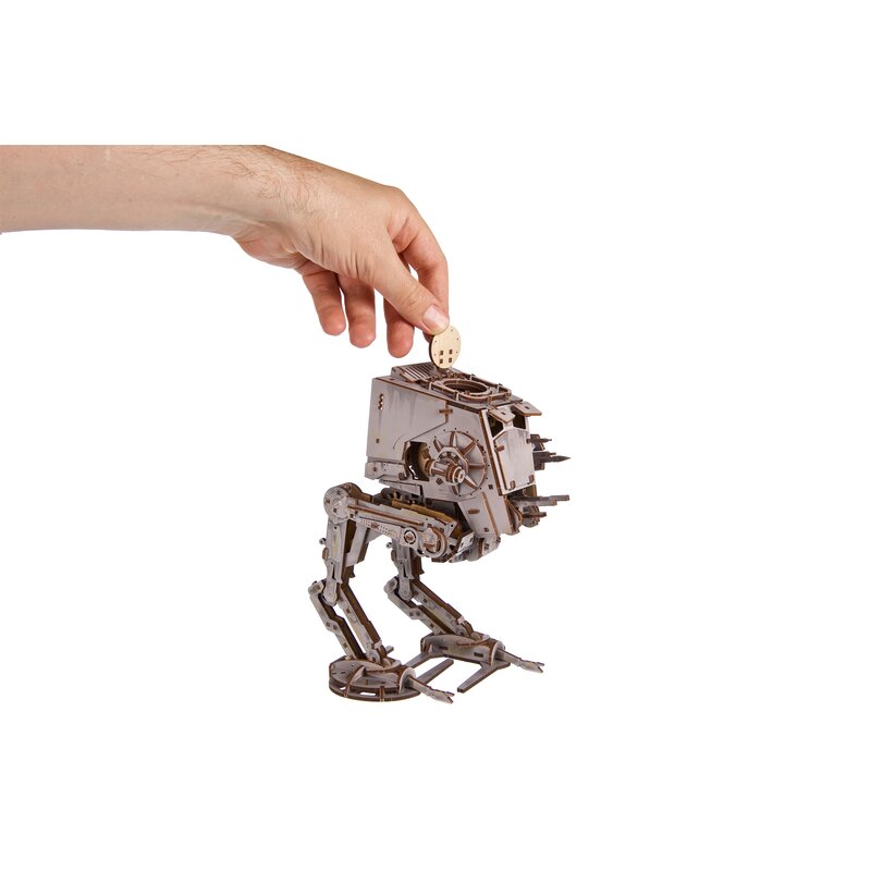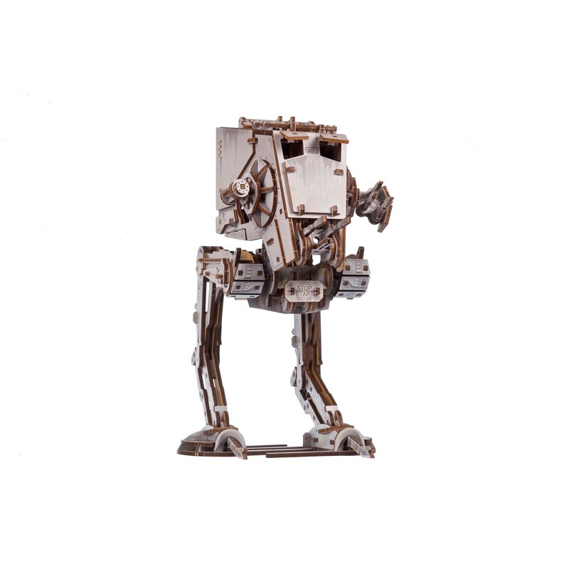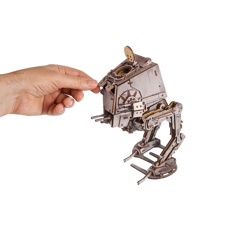 Der AT-ST Walker wird von einer Feder angetrieben und kann 60-80 cm zurücklegen; dabei bewegt er sich langsam und natürlich, praktisch genauso wie sein filmisches Gegenstück. Der Kopf dreht sich hin und her, während sich das Modell bewegt, um eine breite Angriffslinie sicherzustellen. Am Kinn montierte Blasterkanonen und eine an der Wange montierte leichte Blaster und ein Granatwerfer lassen sich mit der Hand hoch- und runterdrehen, die Fenster der Pilotenkanzel und die Dachluke können per Hand geöffnet werden. Das Modell besteht aus farbigem Sperrholz, und zahlreiche graphische Details an der Außenseite verleihen ihm ein realistisches Aussehen. Verschiedene Komponenten aus Metall machen es haltbarer und stabiler. Ziehen Sie den AT-ST Walker auf, indem Sie den verborgenen Schlüssel in die rechte Seite des „Kopfs“ stecken und dann gegen den Uhrzeigersinn drehen. Halten Sie den Körper des Walkers beim Aufziehen fest (aber nicht am Kopf oder an den Beinen, da diese weniger robust sind). Stellen Sie das Modell dann auf eine ebene Fläche, drücken Sie auf den Start/Stopp-Schalter an der Vorderseite des Körpers und schicken Sie den AT-ST so auf seine Mission, um rebellische Widerstandsnester zu zerschlagen!