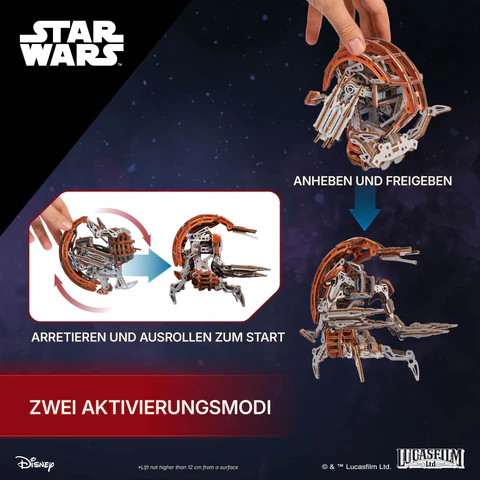 Holzpuzzle von Ugears lässt diese ikonische Transformation mit einem einzigartigen System aus gummierten Hebeln lebendig werden. Falte das Modell manuell zu einer Kugel – und lass es aufspringen, um in Kampfstellung zu gehen, genau wie im Film. Die Blasterarme können unabhängig voneinander ein- und ausgeklappt werden. Das Modell bietet zwei Aktivierungsmodi: Zuverlässiger Modus: Halte es über dem Tisch und lass es los. Spektakulärer Modus: Spanne den Mechanismus ein oder zwei Stufen ein, rolle das Modell und löse so die Transformation für einen noch beeindruckenderen, spielerischen Effekt aus.