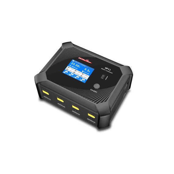 Das neue UP9 Ladegerät. DerVierfach-Lader verfügt über4 x 60WLadeleistung (AC) sowie 3 x 120W +Kanal 1 240W(DC) und bis 5A Ladestrom. Mit der unabhängigen Shuttle-Taste lässt sich das Ladegerät einfach bedienen und ist sehr benutzerfreundlich. Dievier Ausgänge liefern eine Wattleistung von insgesamt 240W (AC) bzw. 600W (DC) welche deine Akkus mit Energienachschub versorgen werden. ACHTUNG: Im Lieferumfang befinden sich keine Balanceradapter. Geeignetes Produkt: 7640159362371 Für den Anschluss von normalen Ladekabeln mit 4mm Goldstecker empfehlen wir folgenden Adapter: 7640182623104