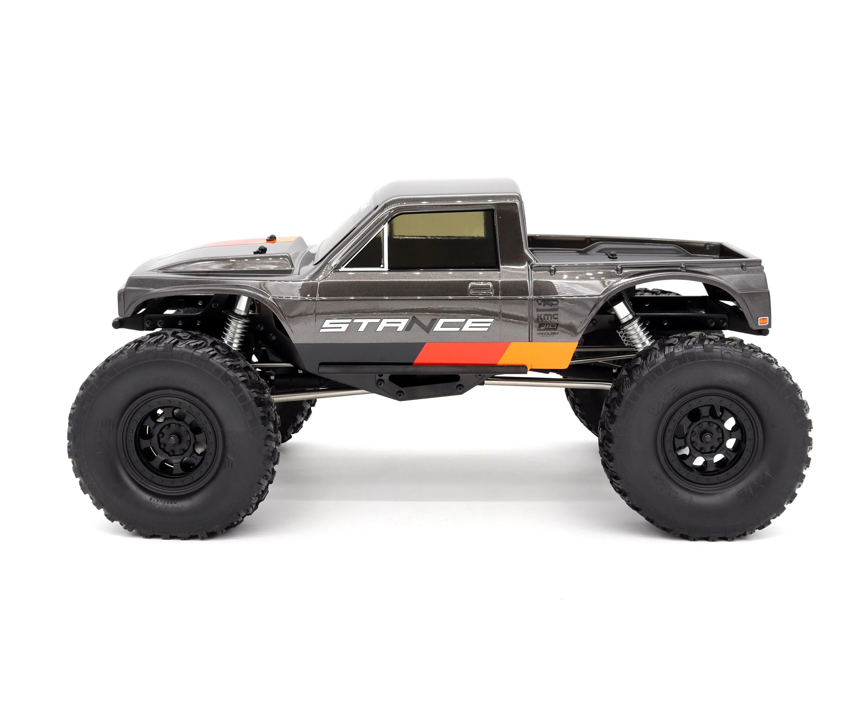 Gestanzte Aluminiumrahmenschienen - 6-Grad flache Gleitplatte Stance Vorlackierte Lexan-Karosserie 24% Übersteuerung F10 Portalachsen Messinggewichtsröhren in den Achsen Legierungsschwere Portal-Knöchelgewichte Vorderachs-Übersteuerungs-Portalgetriebe Hinterachs-Standard-Portalgetriebe Komplettes Metallgetriebe-Antriebssystem Chrom-Molybdän-Universal-Achswellen Incision S8E Stoßdämpfer Edelstahl-Links mit gebogenen Hinterlinks Incision M4-Stangenenden Gestanzte Aluminium-Felsenschutzleisten Einstellbares Mehrpunktkarosserie-Montagesystem Chassis