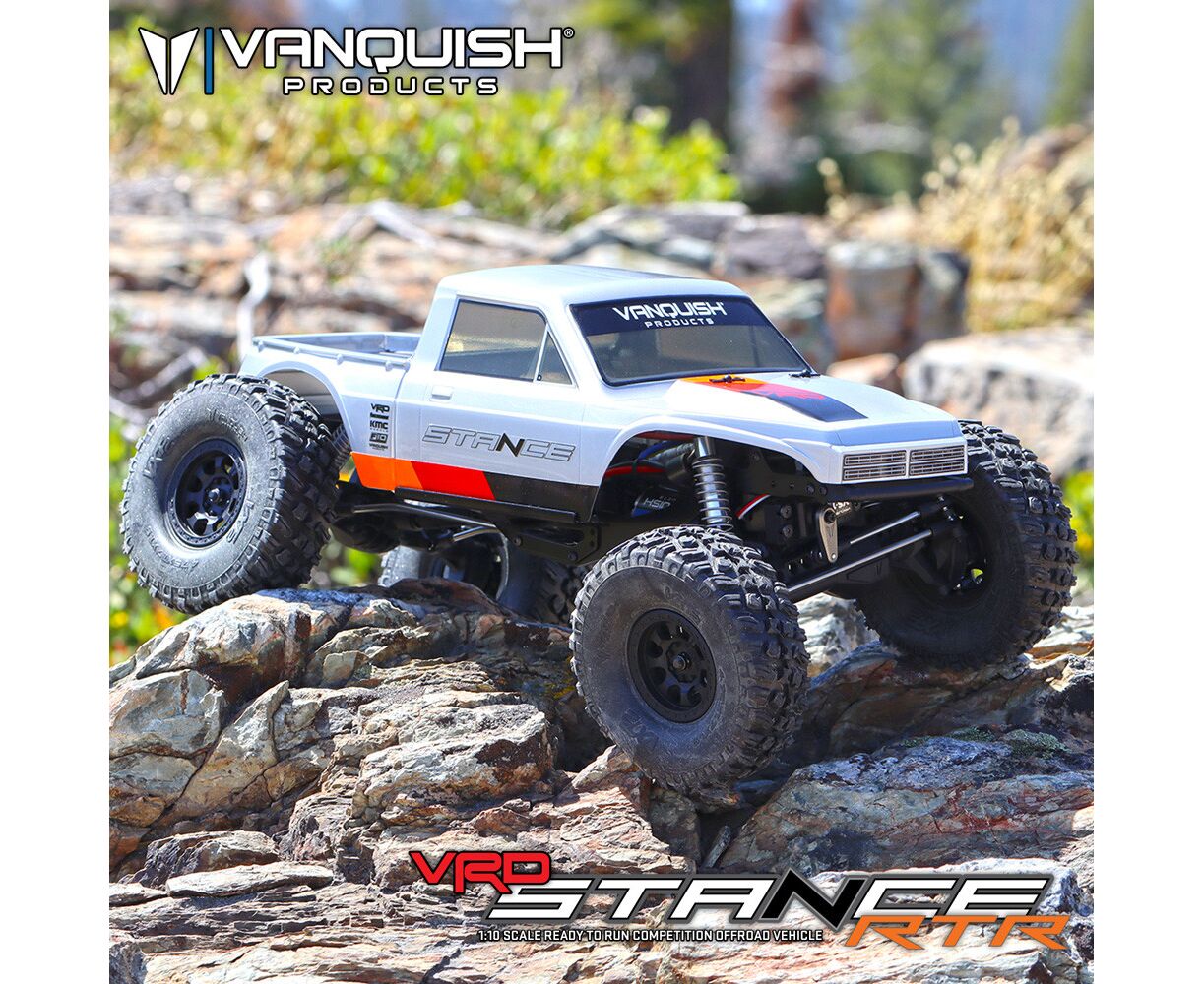 Der Vanquish Products VRD Stance RTR ist eine hochkonkurrenzfähige, vorhersehbare und vielseitige Leistungsplattform. Das Herzstück des VRD Stance RTR sind die gestanzten Aluminiumrahmenschienen, die mit der 6-Grad flachen Gleitplatte und dem VFD-Getriebe verbunden sind. Die geformten Chassiskomponenten und die Gleitplatte positionieren das VFD-Getriebe so tief wie möglich im VRD-Chassis. Die vordere F10 Portalachse ist mit einem Servo auf der Achse und einer 4-Link-Aufhängung ausgestattet. Vorder- und Hinterachsen enthalten gewichtete Messingröhreneinsätze sowie vordere Legierungsknöchelgewichte, um den Schwerpunkt so niedrig wie möglich zu halten und somit eine hohe Fahrleistung zu erzielen. Die roten VXT2-Reifen der Red Compound-Klasse werden von 4,75" VTS Stance Dual Stage-Schäumen unterstützt. Die Lexan-Stance-Karosserie ist wettbewerbsinspiriert mit ihren kurzen Überhängen und dem zugekniffenen Design für maximale Reifenfreiheit.