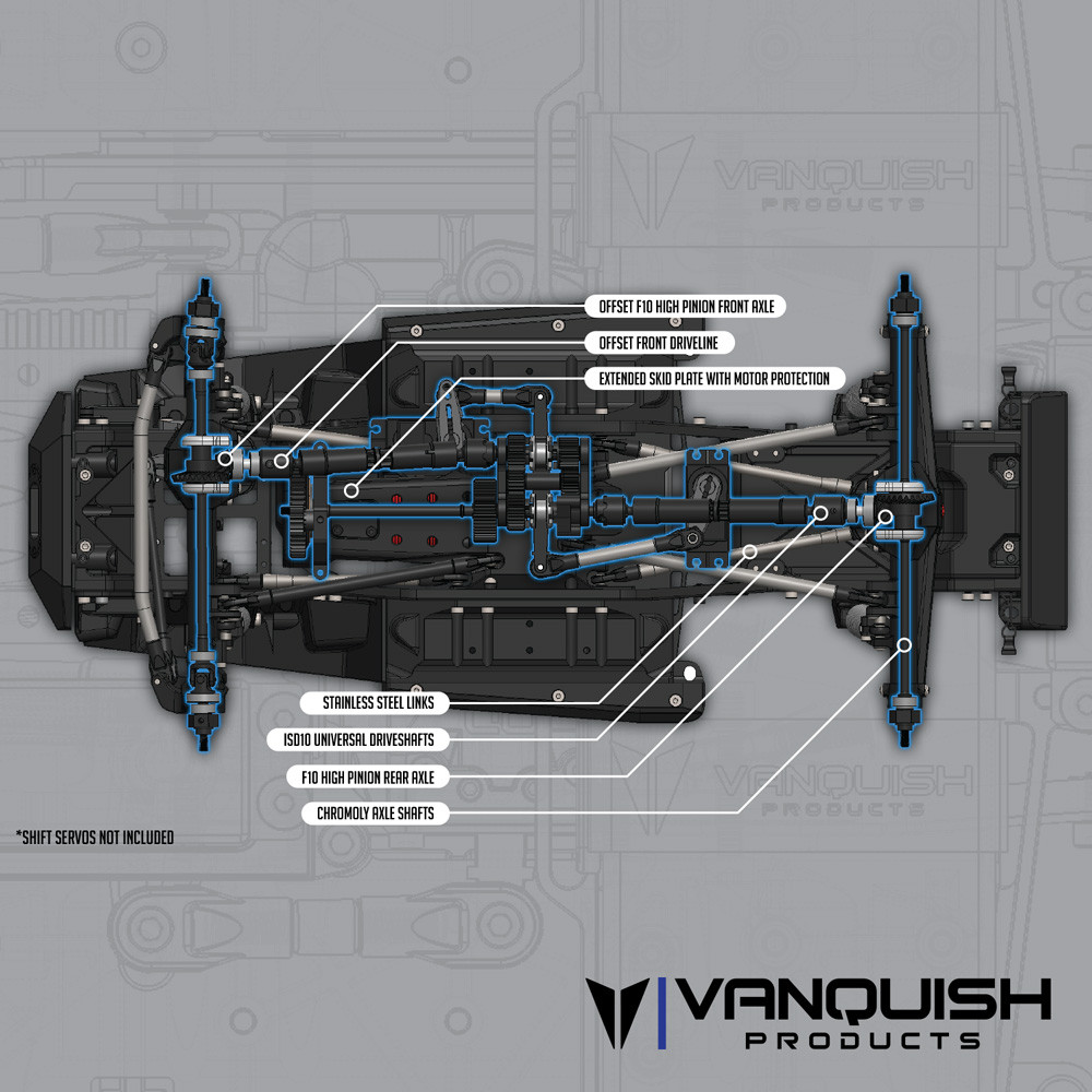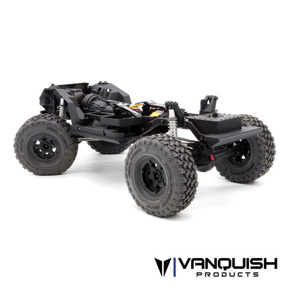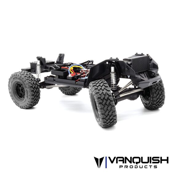 The VS4-10 Phoenix RTR is the first RTR platform from Vanquish Products. Features the VFD Twin transmission and F10 Straight Axles. Included is a full function digital 4 Channel VT-1 Transmitter with multiple model memory and end point adjustment, making the VS4-10 Phoenix RTR ready to be equipped for fully functioning Dig and Selectable OD. Or run it out of the box with 6% OD powered by a 35T VM-1 Motor and VE-1 3S capable ESC. The large diameter Stainless Steel links bring high end Vanquish Products kit quality to the RTR market. The drivetrain is equiped with machined ring and pinion gears, chromoly universal axle shafts, and chromoly 6-bolt spools for the ultimate in durability. Full ball bearings, metal transmission gears and 32P spur / pinion provide smooth and reliable performance when tackling the toughest terrain.