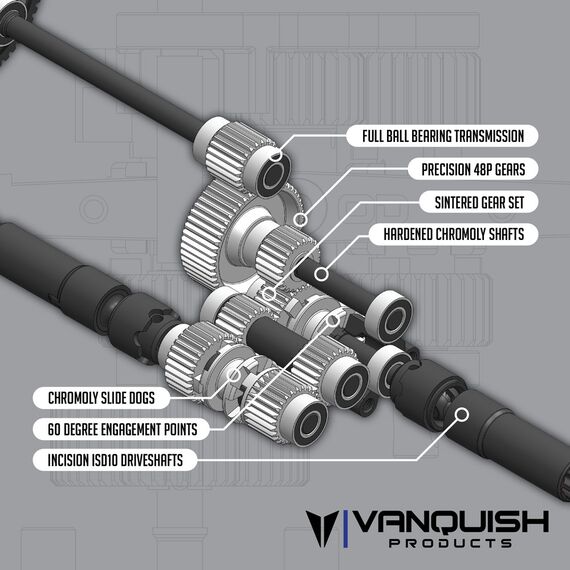 VFD Twin Transmission is an evolution of the original VFD. Taking the same balance of performance, scale appearance, strength, and adding industry first features. The VFD Twin comes equipped with selectable overdrive and rear dig. Twin shifting transfer case utilizes replaceable bearing plates, a brass pivot for the shift arms, and chromoly shift slides. Borrowing from our proven Hurtz dig, the VFD twin shifting is smooth and reliable. On the fly overdrive shifting from 6.5% to 46% makes an immediate change to the driving characteristics and tuning options. The VFD Twin transmission places the motor forward and as low as possible. Compatible with 540 brushed and brushless motors*
