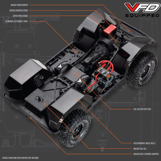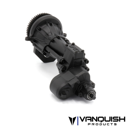 The VFD Spec Transmission from Vanquish Products is designed to provide an optimal balance of performance, scale appearance, strength and versatile optional accessories. The VFD's design places the motor forward and as low as possible to keep the weight where you want it. The VFD's combination of offset front T-case output and offset pumpkin of the Currie front axle make this possible. The T-case utilizes unique bearing plates for high strength bearing positioning and the elimination of flex found in traditional housings. The modular design of the bearing plates allow for optional gear ratios to be used inside the T-case.