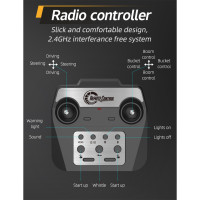 Das Modell besteht aus robustem ABS-Kunststoff und ist mit hochwertigen Metallteilen wie Schaufel, Hubarm und Handläufen ausgestattet. Angetrieben von einem 7.4V Akku überzeugt der Radlader durch ein zuverlässiges Spindelantriebssystem, das Lasten von bis zu 5 kg hebt und den Metall-Hubarm ausfahren kann.