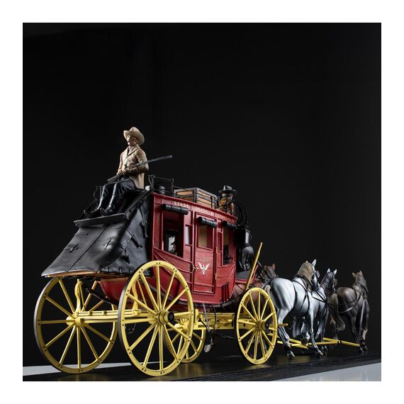 Dieses Set ist aus hochwertigen Materialien gefertigt, darunter europäisches Kunstharz mit hoher Dichte für die Figuren und Pferde, koreanisches Acryl für die optionalen Vitrinen (separat erhältlich) und in Spanien hergestellte Farben, die Langlebigkeit und historische Genauigkeit gewährleisten. Die Postkutsche besteht aus massivem Holz, Messing und Leder, um die Ästhetik der 1850er Jahre originalgetreu wiederzugeben.