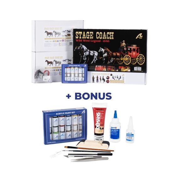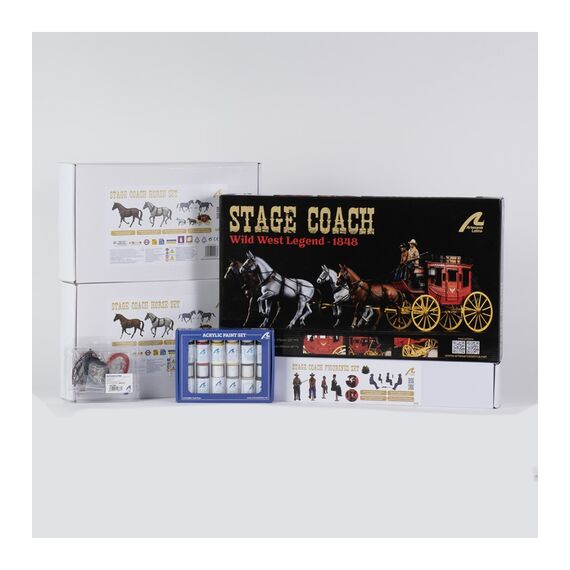 Das Set (Artikel 20345L) enthält den Modellbausatz Stage Coach 1848 (Artikel 20345), 4 Pferde (Artikel 20345H), 4 Figuren (Artikel 20345F), ein Beleuchtungsset (Artikel 27590), 12 Acrylfarben (Artikel 277PACK33) und Bonusartikel: Farbset für Fortgeschrittene für Figuren (Artikel 277PACK15), Finishing Set mit Spachtelmasse, Weißleim und Sekundenkleber (Artikel 277PACKB5) und Essential Hobby Tools.